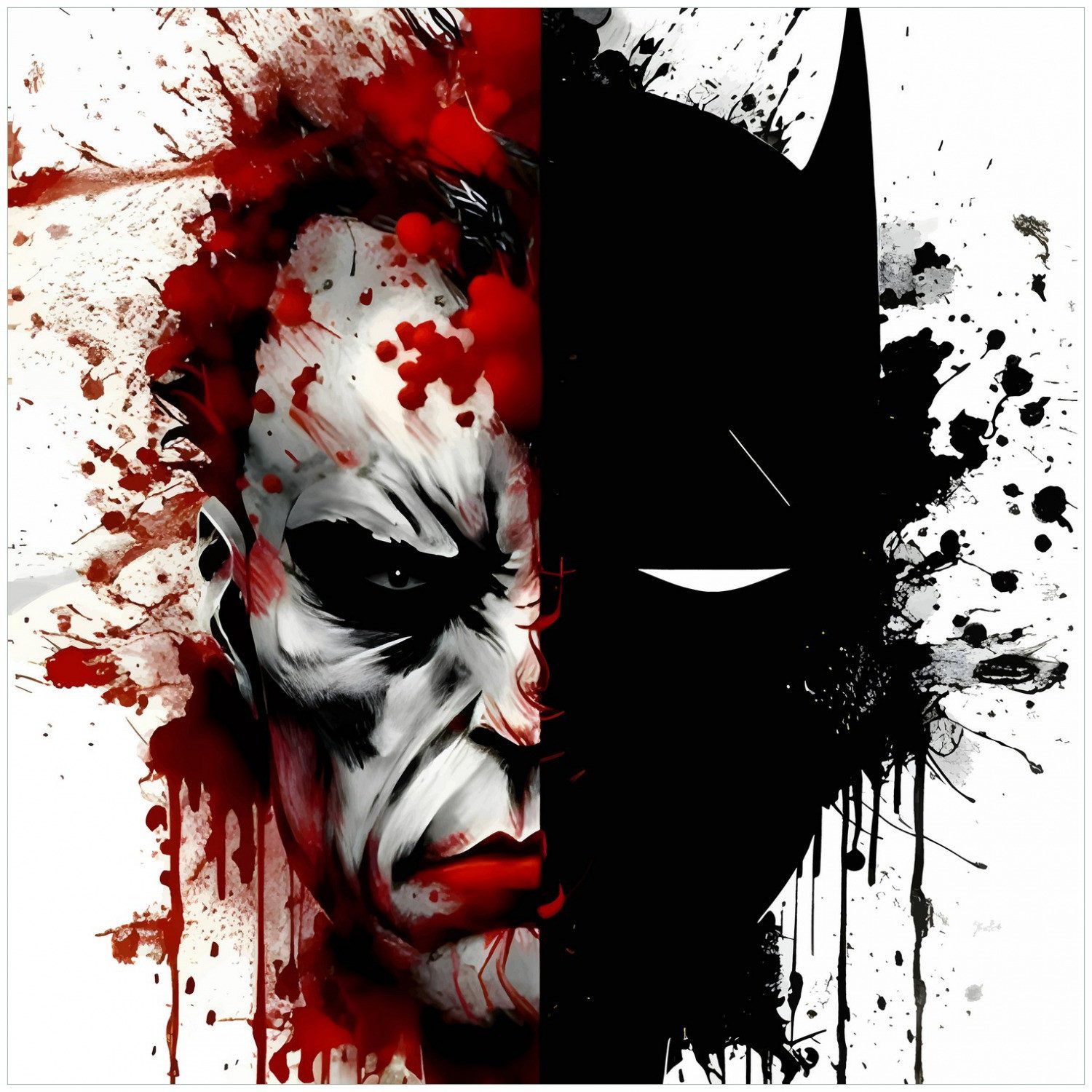 Diese ausdrucksstarke Illustration zeigt zwei Hälften eines Gesichts: eine menschlich, blutig und verzerrt ? die andere maskiert, dunkel und undurchdringlich. Die verlaufenden Farben und Tintenflecken verstärken den inneren Konflikt zwischen Licht und Schatten, Menschlichkeit und Mythos.