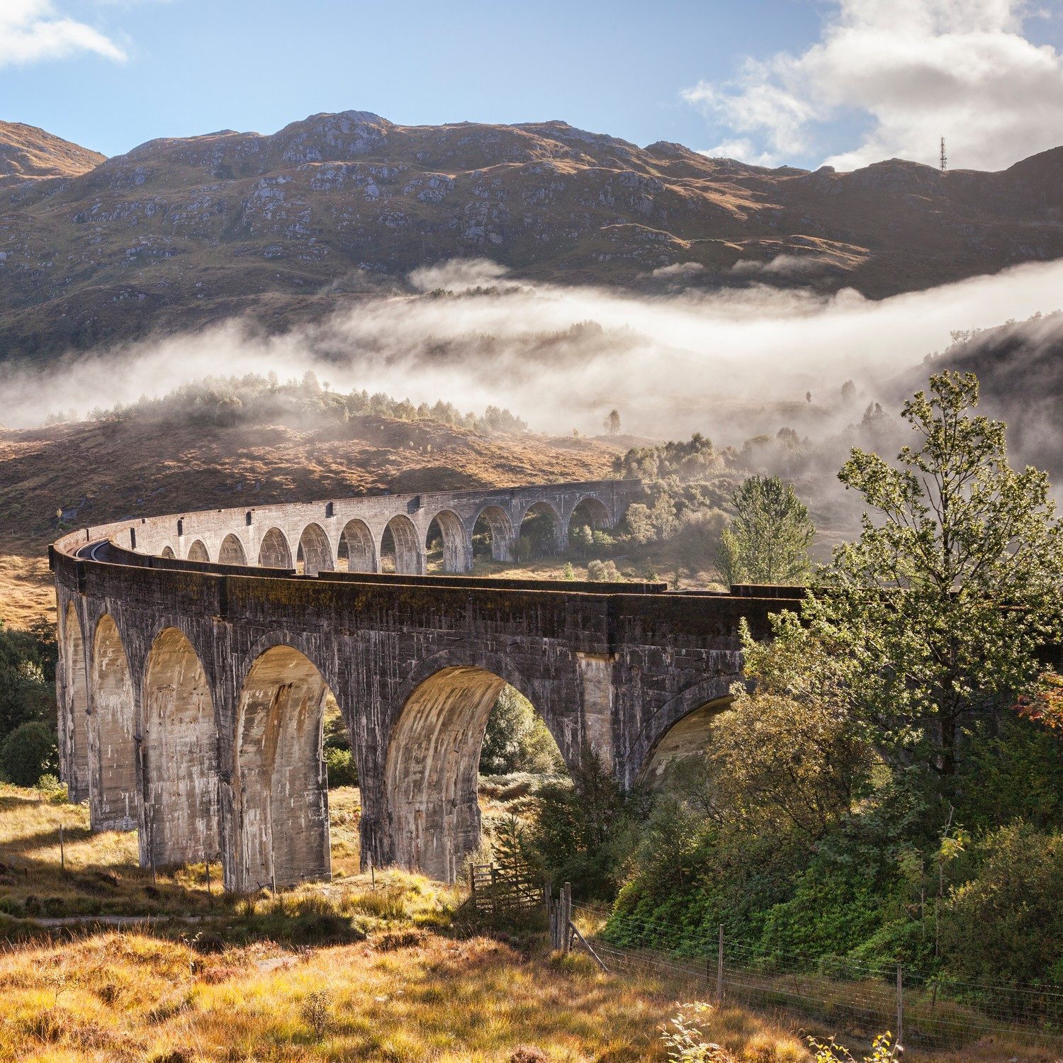 Eine geschwungene Überführung zieht sich eindrucksvoll durch eine herbstlich gefärbte Hügellandschaft. Sanfte Nebelschwaden gleiten durch das Tal und verleihen der Szene eine mystische Stimmung. Die Kombination aus technischer Baukunst und unberührter Natur schafft eine zeitlose, beinahe märchenhafte Atmosphäre.
