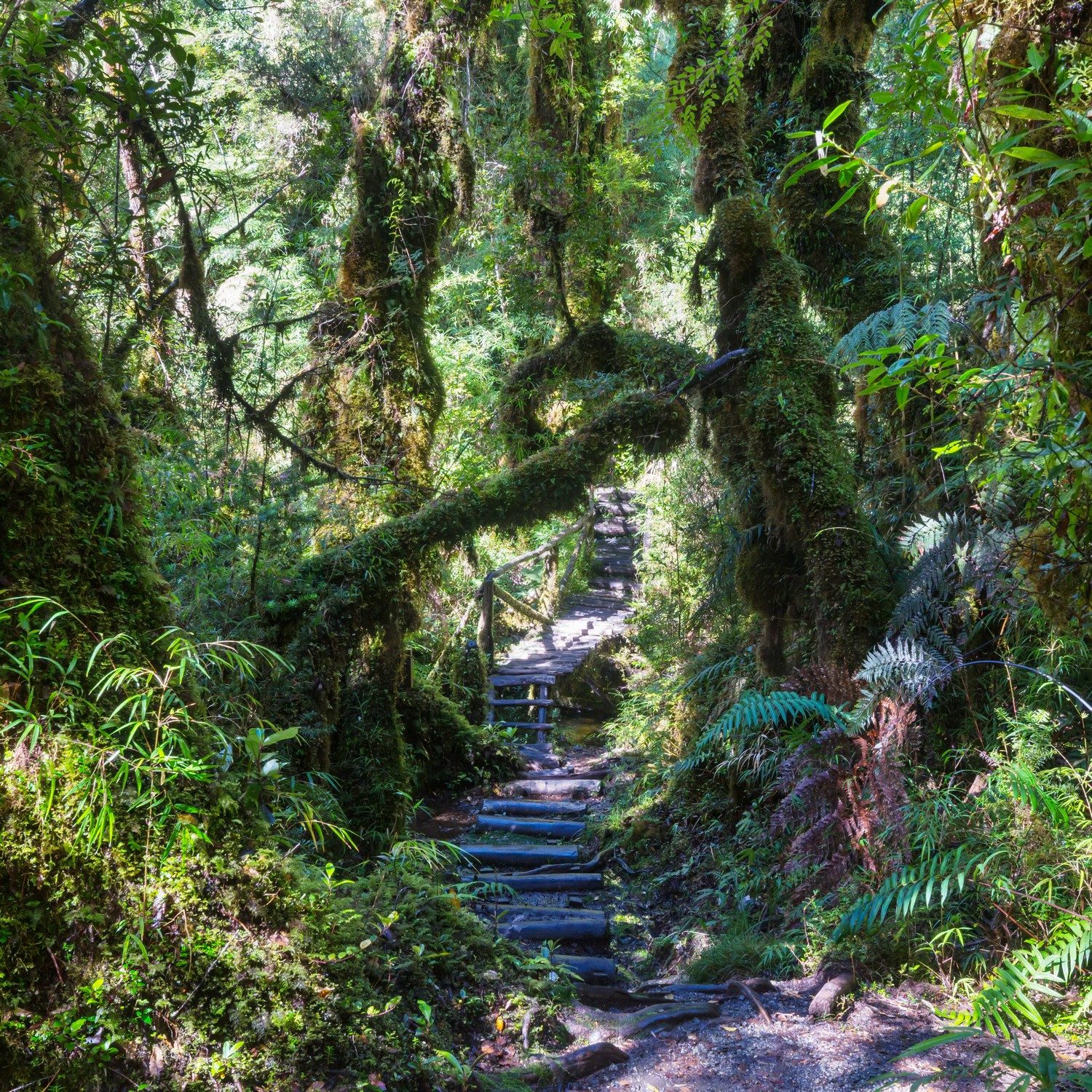 Ein schmaler Pfad mit Holzstufen schlängelt sich durch einen dichten, moosbedeckten Wald. Sonnenlicht dringt durch das grüne Blätterdach und lässt das satte Grün lebendig wirken. Die Szene wirkt geheimnisvoll und lädt zu einem stillen Naturerlebnis abseits bekannter Wege ein.