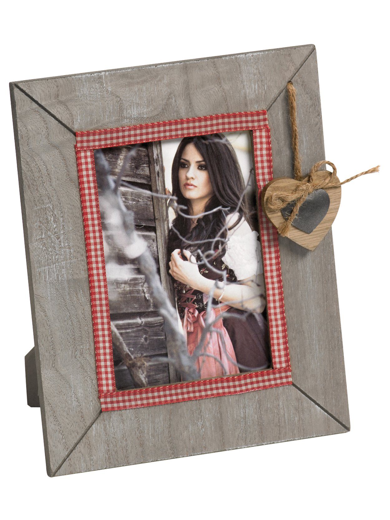 Der Portraitrahmen ‚Bavarian Heart‘ besteht aus einer breiten Leiste mit Patina. Der Holzrahmen hat eine Stoffumrandung im Karo-Design, welche das Foto hervorhebt. Des weiteren verfügt der Bilderrahmen über ein Herz aus Holz, welches an einer Kordel am Rahmen befestigt ist. Das Foto wird durch ein Klarglas geschützt. Die Rückwand verfügt über einen Aufsteller und Aufhänger für Hoch- und Querformat. Die Serie „Bavarian Heart“ gibt es in unterschiedlichen Ausführungen. Die Serie „Bavarian Heart“ gibt es in unterschiedlichen Ausführungen.