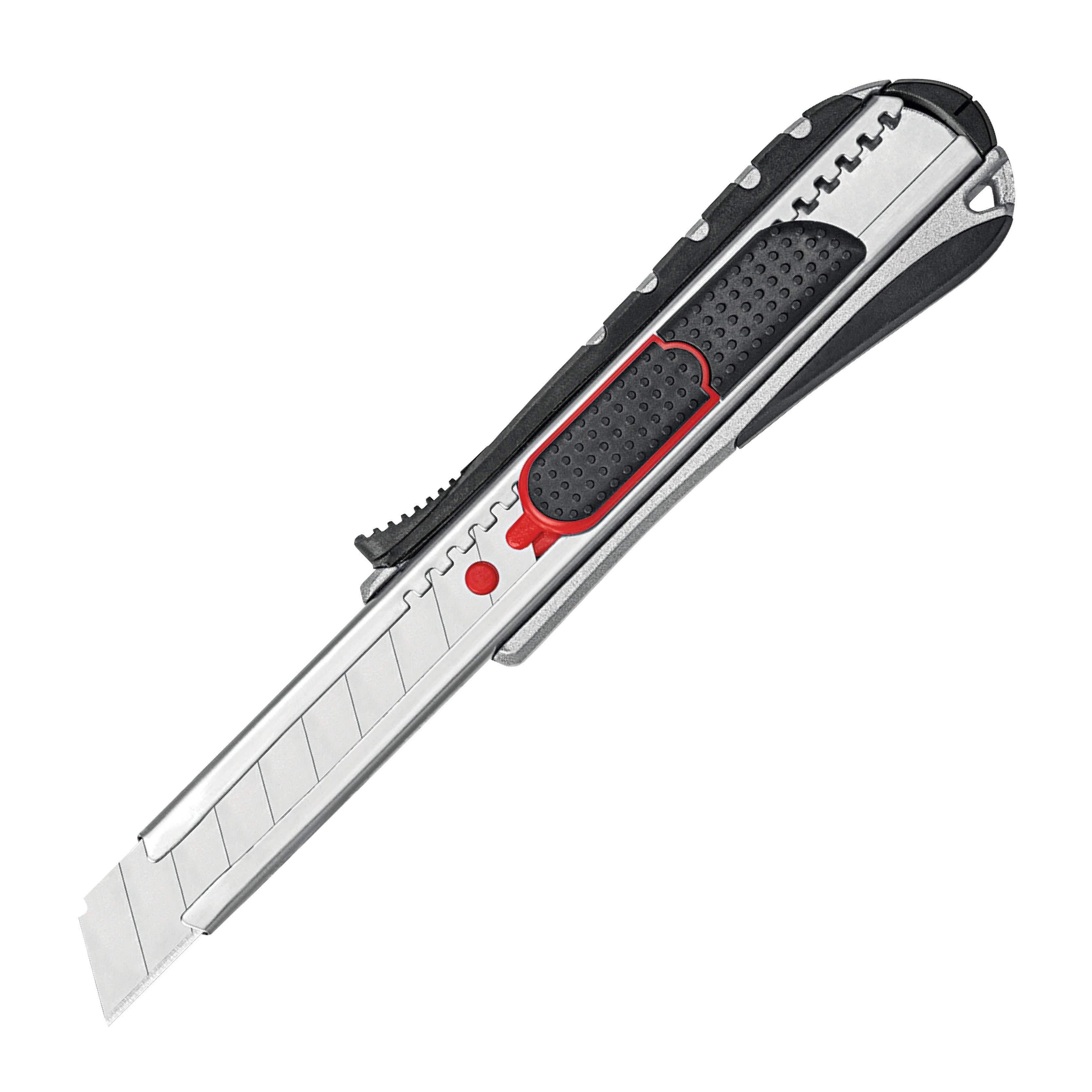 Der Wedo Cutter 2 in 1 ist ein Universalmesser, mit dem Sie Gipskarton, Pappe und dünne Kunststoffe schneiden können. Hierbei ähnelt der Safety Cutter äußerlich dem klassischen Cuttermesser. Dabei besteht die Klingenführung aus Metall und vereint die besten Eigenschaften eines klassischen Cutters und einem Safety Cutters. Gefertigt ist der Cutter aus Gusseisen. Das Universalmesser ist besonders hart und robust und neigt bei mechanischen Einflüssen dazu einzudellen, anstatt zu bersten. Die Griffzone ist mit einer gummierten Schicht überzogen, damit das Cuttermesser sicher in der Hand liegt. Sie haben die Wahl, wie Sie den Cutter einsetzen möchten. Entweder schieben Sie die Klinge wie gewohnt über die Rasterautomatik nach vorne oder Sie verwenden den automatischen Klingenrückzug. Hierbei ist es wichtig, dass Sie während des Schneidevorganges den Klingenschieber nicht festhalten. Wenn ein Glied der Klinge stumpf wird, können Sie dieses Glied mit der integrierten Abbrechhilfe abbrechen und den nächsten scharfen Schnitt machen.