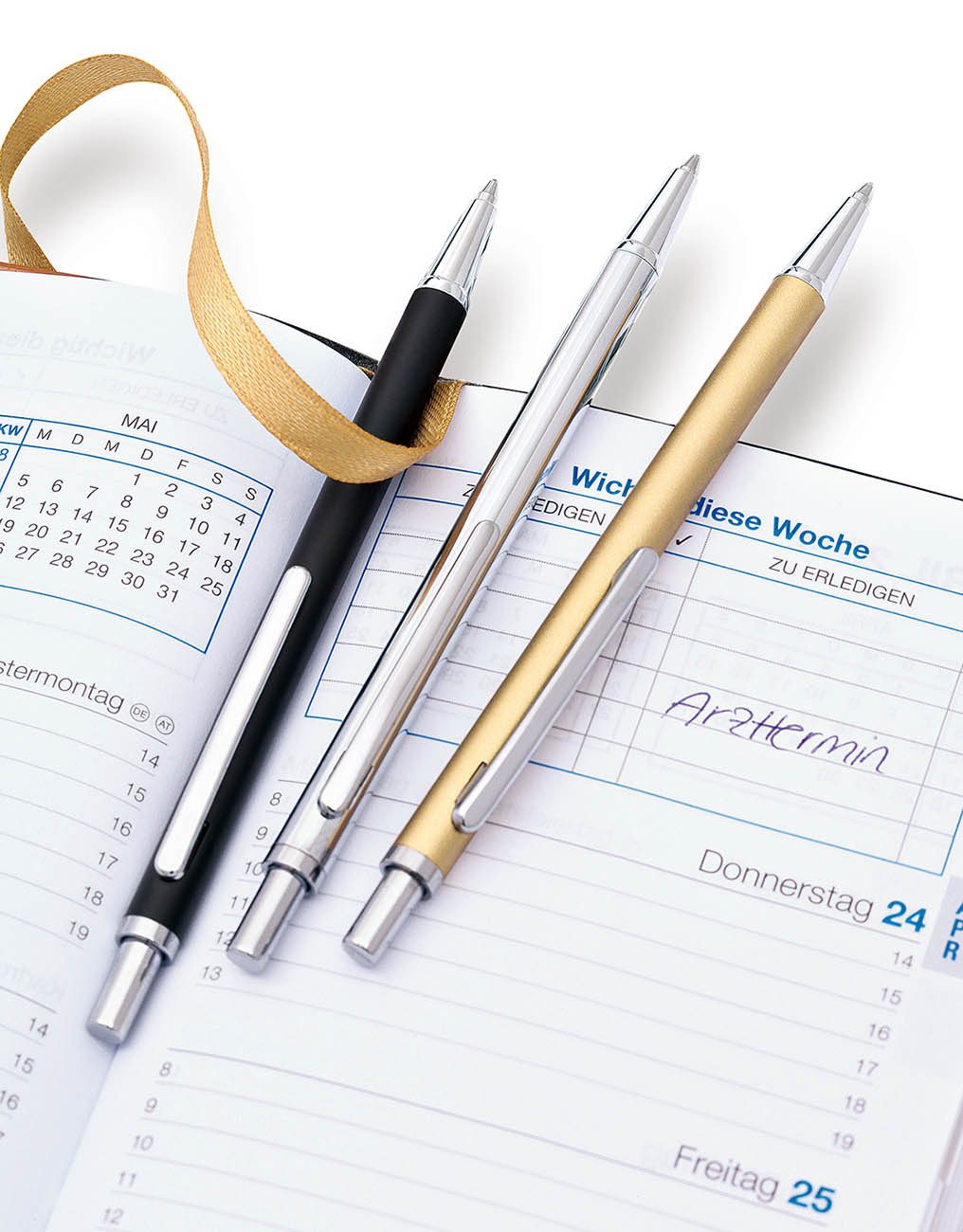 Die kleinen Druck-Kugelschreiber mit Clip finden überall Platz - im Notizkalender oder Tagesplaner, in der Brieftasche oder im Portemonnaie - stets griffbereit für die kleinen Notizen zwischendurch.
