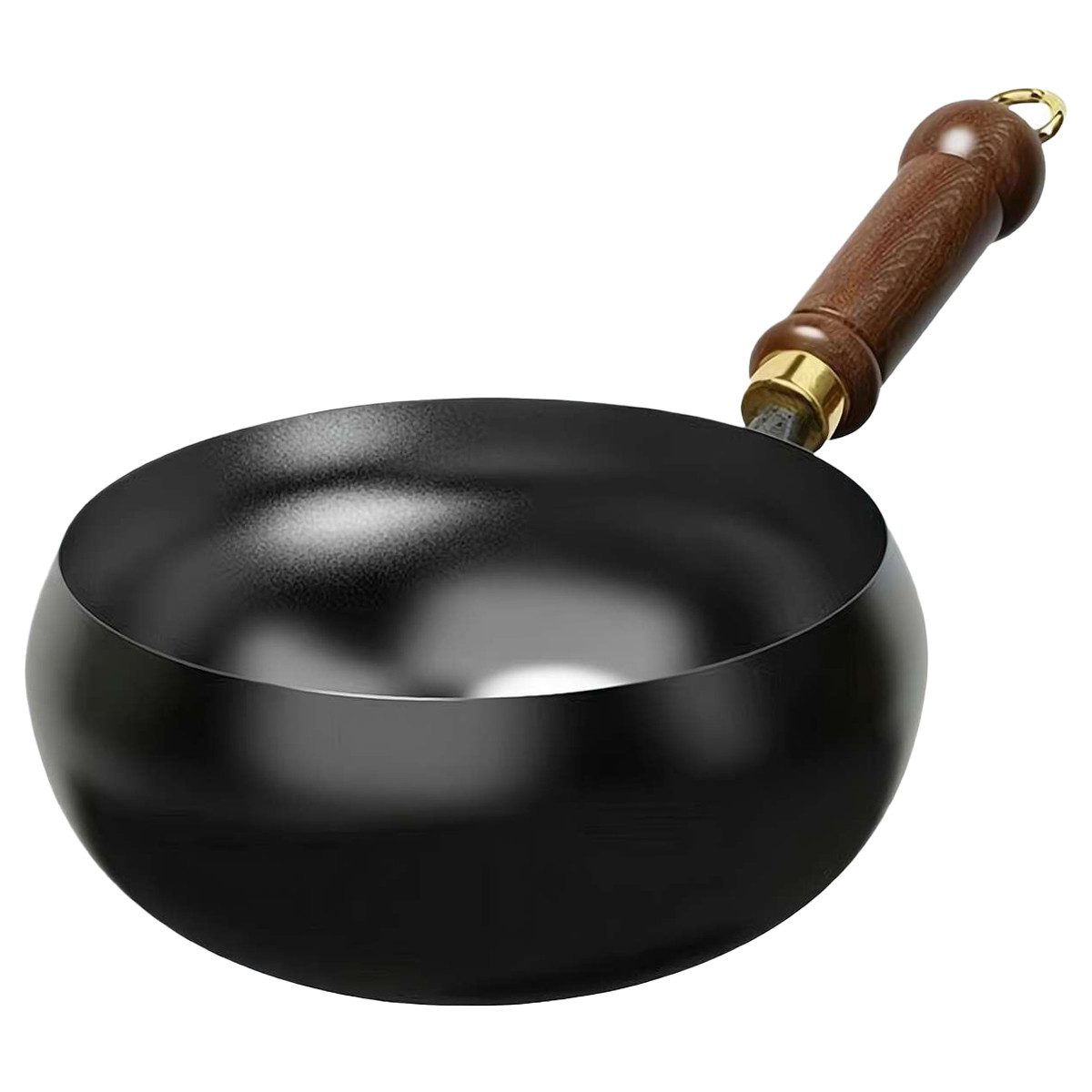 Hitzebeständiger Holzgriff: Der Griff des Pfanne ist aus Holz, hitzebeständig, angenehm zu halten und reduziert Wärmeleitung.