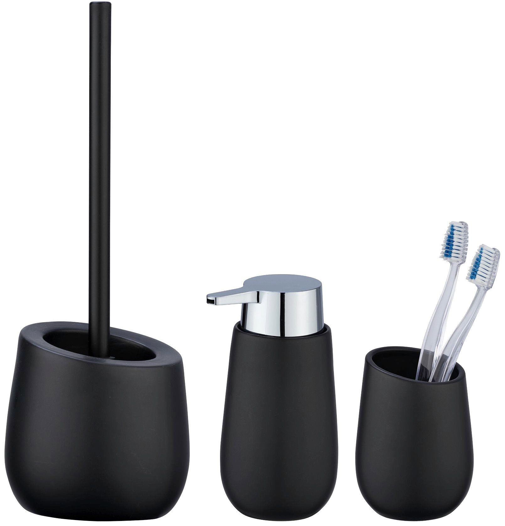 Die zeitlos schöne Bad-Serie Badi aus hochwertiger Keramik verleiht jedem Badezimmer eine moderne Eleganz. Im klassischen, schwarzen Gewand mit matter Oberfläche werden die Badi-Accessoires zu einem Blickfang in jedem Badezimmer und Gäste-WC. Im komfortablen dreiteiligem Set Badi von Wenko sind Seifenspender, WC-Garnitur und Zahnputzbecher enthalten. Mit der praktischen WC-Bürste kann das WC gründlich gereinigt werden. Die Bürste gewährleistet durch ihre strapazier- und anpassungsfähigen Silikon-Borsten eine zuverlässige Nutzung. Sehr bewährt hat sich der integrierte Randreiniger, dessen robuste und anschmiegsamen Borsten geschickt unter den WC-Beckenrand gelangen und dort säubern, wo herkömmliche Bürsten nicht hinkommen. Der hochwertige, schwarze Bürstenkopf von Ø 7,5 cm ist aus Silikon gefertigt und auswechselbar. Seine spezielle Anti-Haft-Wirkung sorgt dafür, dass sich hartnäckige Reste und Toilettenpapier nicht in der Bürste festsetzen, sondern beim Reinigen einfach weggespült werden. So bleibt die clevere Bürste immer hygienisch sauber und reinigt sich selber. Der charmante Seifenspender kann individuell mit 320 ml Flüssig-Seife oder Lotion befüllt werden. Durch leichten Druck auf den Dosierkopf wird die gewünschte Menge Seife oder Lotion herausgepumpt. Auch in der Küche kann der Spender ideal mit Spülmittel befüllt werden, um so das lästige Spülen schöner zu gestalten. Und schon haben die alten, unschönen Plastikflaschen ausgedient. Im eleganten Zahnputzbecher Badi können Sie stilvoll Ihre Zahnbürsten und Zahnpasta griffbereit aufbewahren. Wie wäre es mit einem Becher für jedes Familienmitglied?