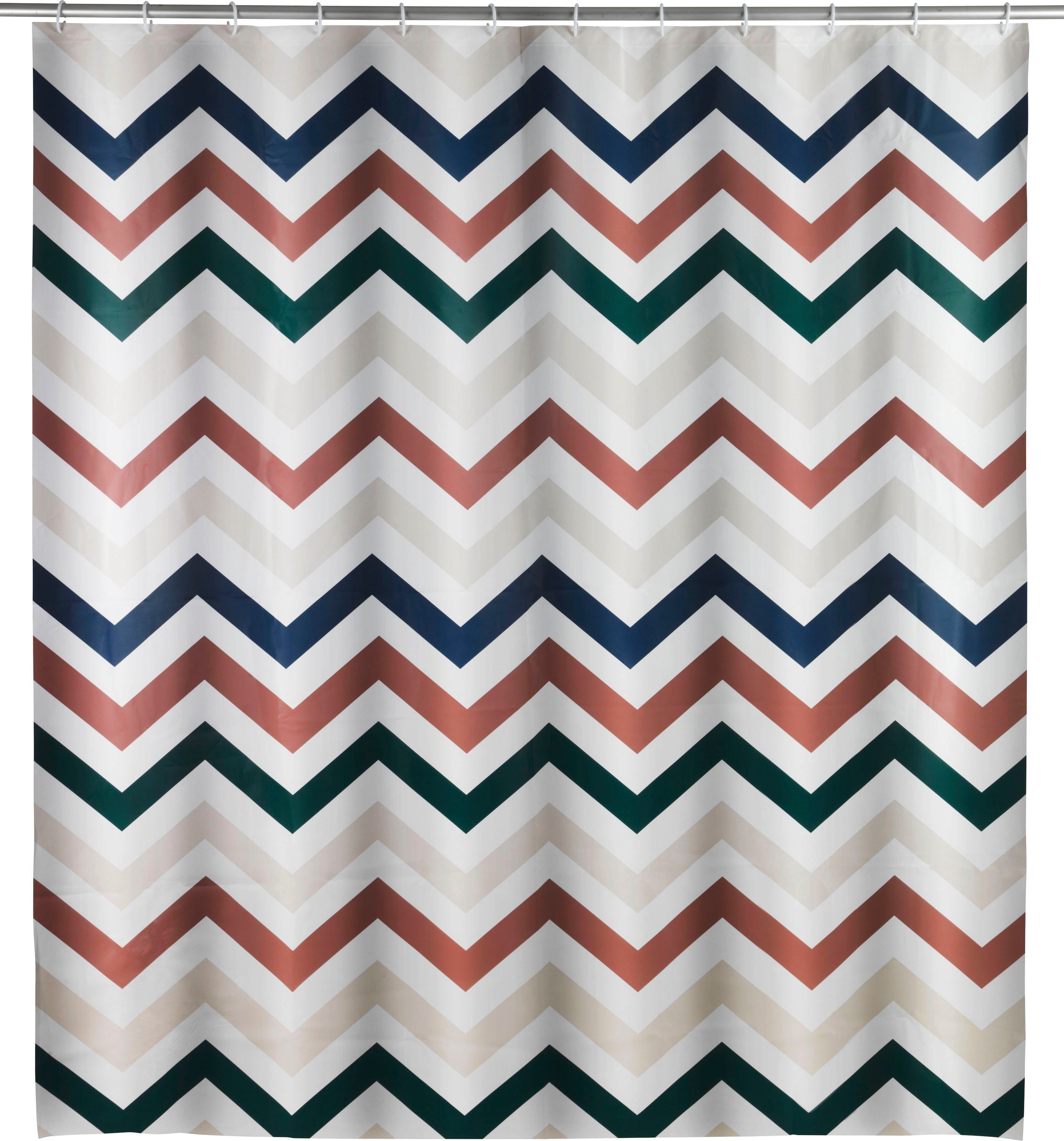 Der Duschvorhang Agropoli von WENKO wird zum Design-Trend in Ihrem Badezimmer! Versehen mit einem Zackenmuster in ansprechenden Farben, wird der Duschvorhang mit seinem geometrischen Dekor zu einem absoluten Hingucker in Ihrem Bad! WENKO kombiniert mit diesem Vorhang ausgefallenes Design und komfortable Funktionalität. So ist der praktische Duschvorhang aus recyclingfähigem Kunststoff-Film (PEVA) hergestellt und wasserdicht. Durch die Oberflächen-Veredelung erhält das Material einen wasserabweisenden Effekt, der zusätzlich für ein einfaches Abperlen von Feuchtigkeit und Wasserspritzer sorgt. Die Feuchtigkeit sammelt sich nicht mehr in den Vorhangfalten. Die Duschvorhänge sind deswegen besonders lange haltbar und trocknen nachweislich schneller. Im Lieferumfang enthalten sind 12 weiße Duschvorhangringe aus Kunststoff enthalten. Mit einer Breite von 180 cm eignet sich der Vorhang sowohl für Dusche als auch Badewanne. WENKO hat weitere Bad-Accessoires im Sortiment, die die ideale Ergänzung zu dem harmonisch gestalteten Duschvorhang bilden. Die Querstreifen im Zackenmuster in den Farben Creme, Braun, Dunkelblau und Dunkelgrün ermöglichen die Kombination von verschieden farbigen Badutensilien.