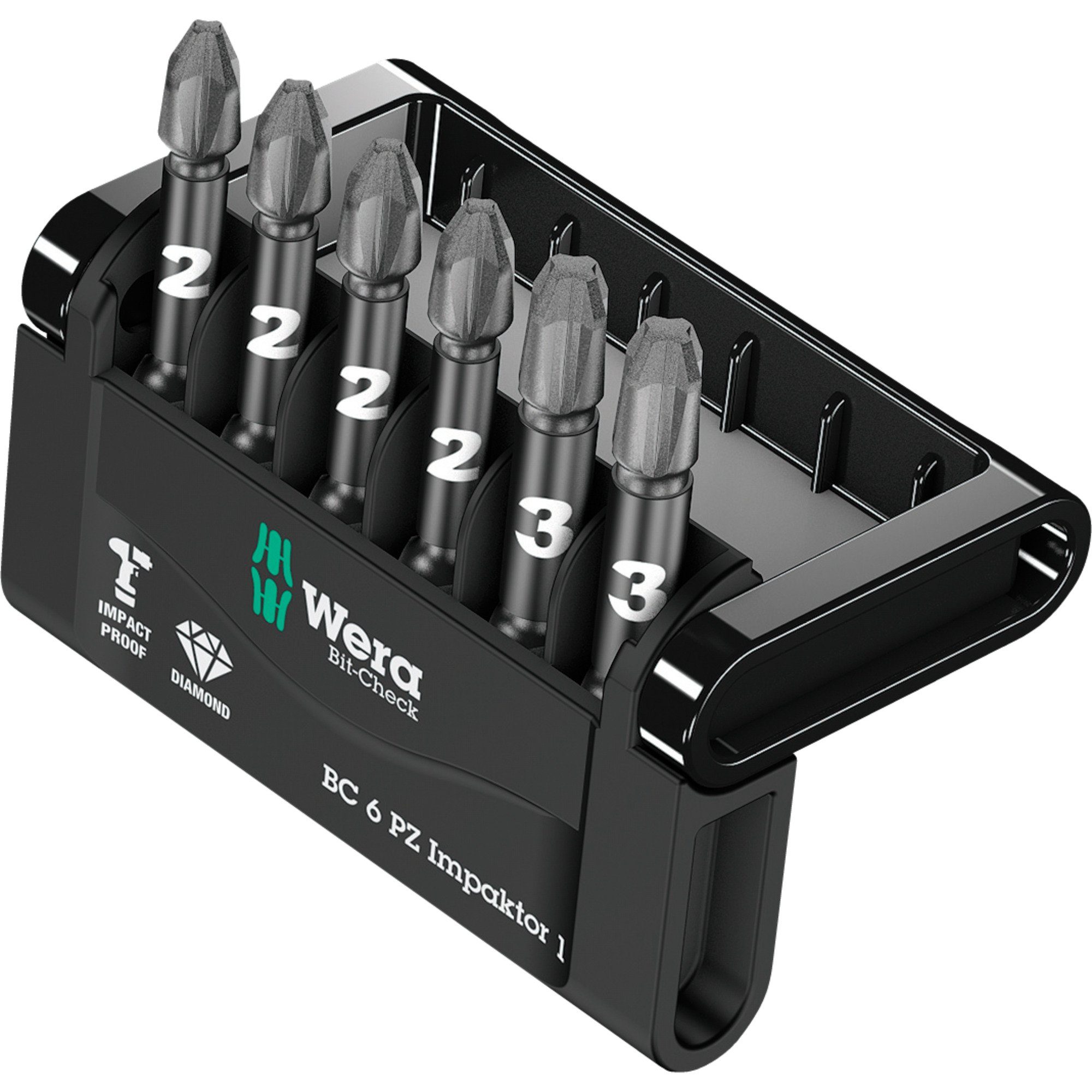 diamantbeschichtet, extrem belastbar Das 6-teilige Set Wera Bit-Check 6 PZ Impaktor 1 besteht aus sechs 25mm langen Impaktor Bits mit Kreuzschlitz Profilen, übersichtlich angeordnet auf engstem Raum im praktischen Bit-Check. Die 6 Bits haben eine Diamantbeschichtung zur Reduktion der Abrutschgefahr. Die winzigen Diamantpartikel beißen sich beim Schrauben förmlich in der Schraube fest. Die Impaktor-Technologie sorgt durch bestmögliche Ausnutzung der Materialeigenschaften und durch optimal angepasste Geometrien für überdurchschnittliche Standzeiten auch bei extremen Anforderungen. Dieses Set ist besonders geeignet für den Einsatz mit handelsüblichen Impakt- oder Schlagschraubern. Am Arbeitsplatz lassen sich die Bit-Checks aufgeklappt hinstellen, damit ist das Werkzeug immer schnell griffbereit.