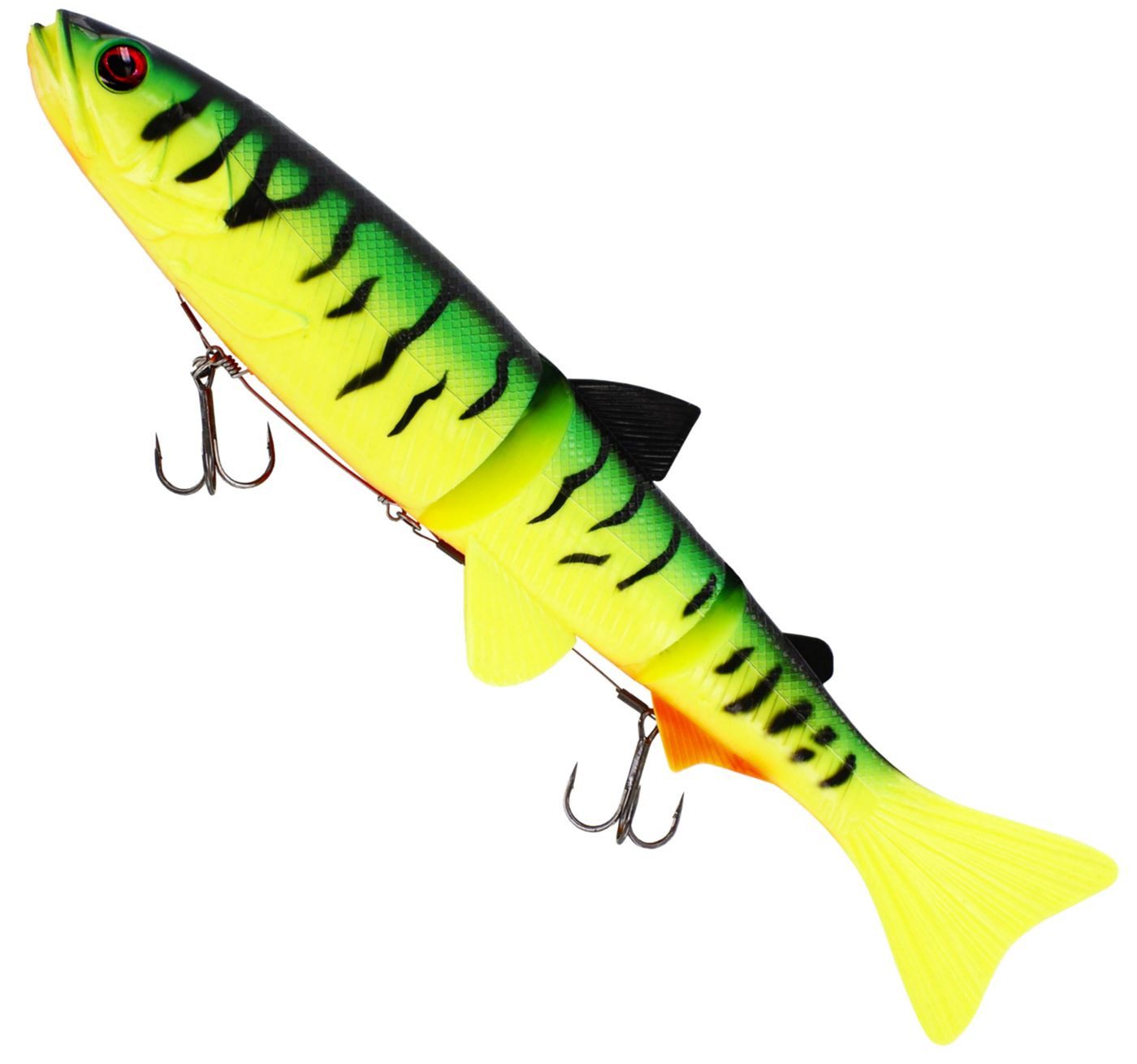 Westin Hypoteez Inline - Swimbait Gummifisch - Die Gummiköder von Westin weisen eine Länge von 35cm auf und sie imitieren einen großen Beutefisch. Mit einem Gewicht von 330g lassen sich die Gummifische sehr gut zum Schleppangeln auf Hecht vom Boot einsetzen und mittels der Lauftiefe von 1-3m kann mit dem Köder das obere Wasserdrittel sowie Flachwasserbereiche nach raubenden Hechten abgesucht werden. Der Gummikörper besteht aus drei zusammenhängenden Gliedern, wodurch der Swimbait sehr beweglich ist und ein S-förmiges Schwimmverhalten entsteht. Der Hechtköder ist mit einem Stahlvorfach ausgestattet, das per Inline-Montage durch das Maul des Köders verlauft und mit zwei Drillingshaken am Bauch versehen ist. Die robusten Carbon-Stahl-Drillinge sind sehr scharf, wodurch beim Biss ein guter Hakeffekt im harten Hechtmaul einsetzt und die auch kampfstarken Hechten problemlos standhalten.