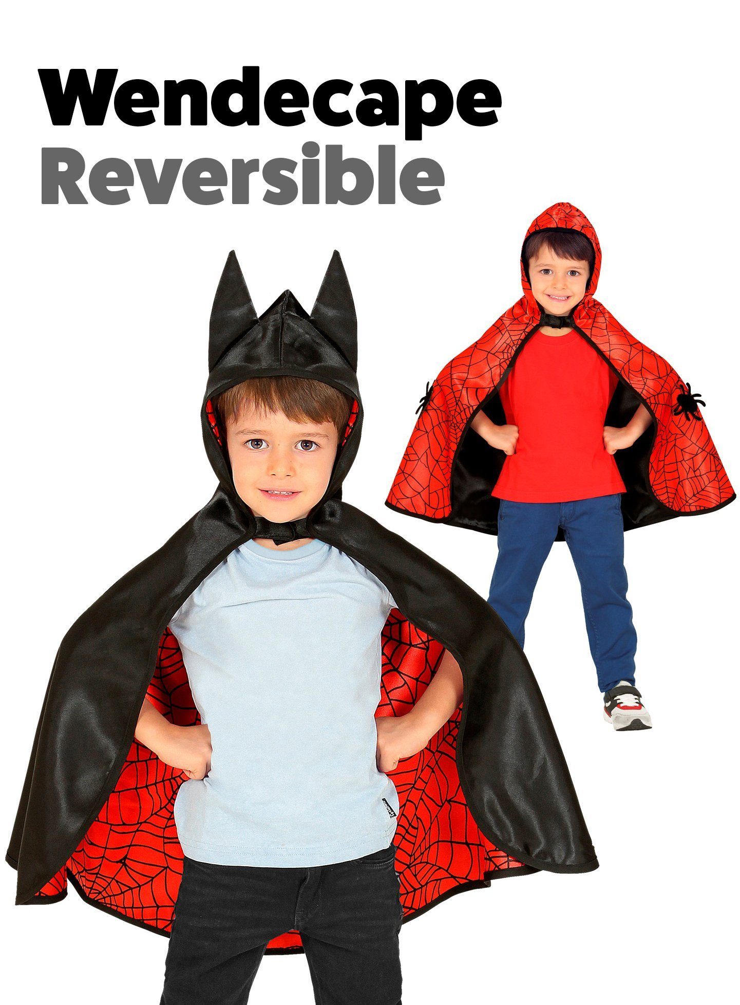 | Ausstattung | - Spiderbat Superhelden Wendecape für Kinder einteilig- mit Kapuzenumhang- ohne sonstige Kostümteile und Accessoires |