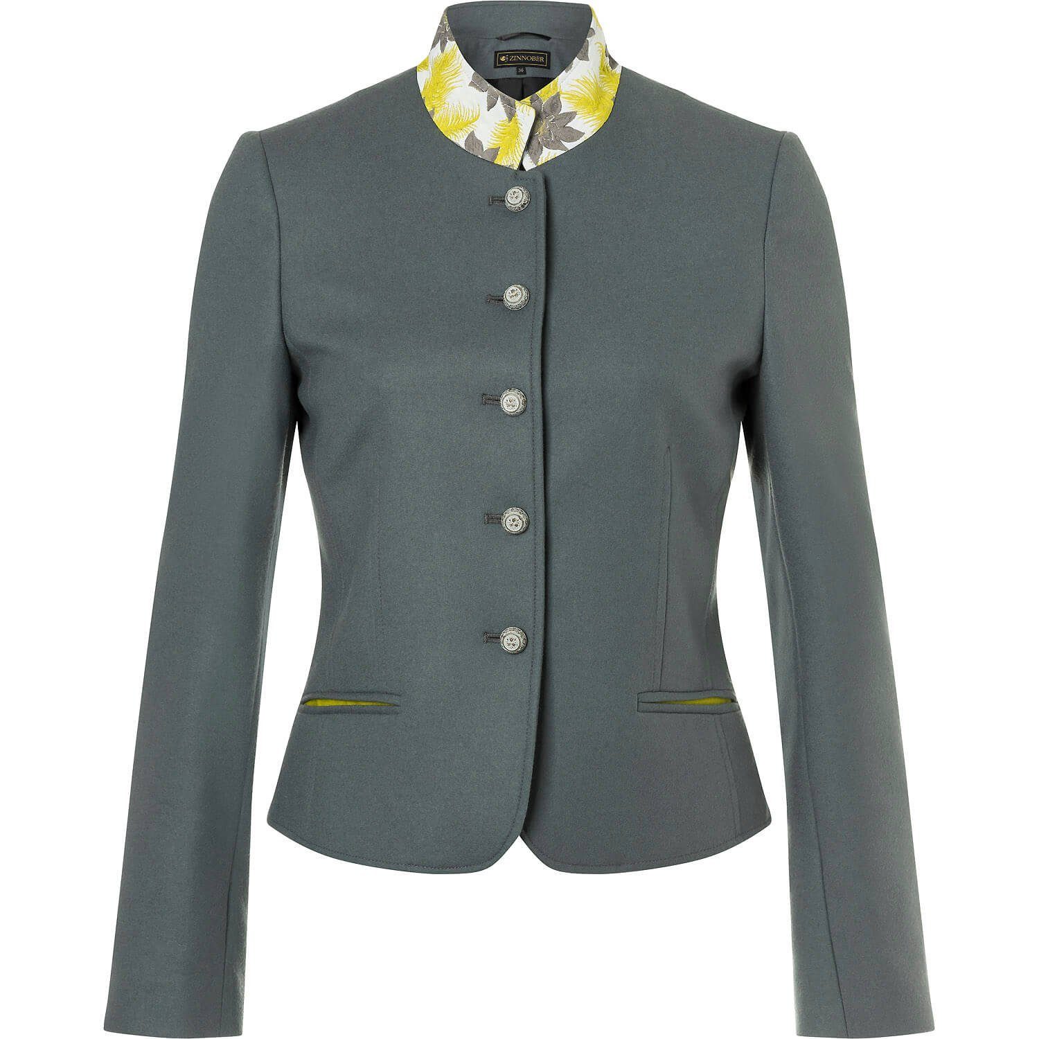 Aus Wiesnkönig's Zinnober Kollektion: Janker Sissi ist perfekt zur Jeans genauso wie zu Kleidern und Röcken. Leicht tailliert geschnitten. Der graue Wollstoff mit leichtem Glanz lässt sich zu Vielem tragen. Der Stehkragen ist abgesetzt mit einem edlen Jaquartstoff in grau-gelb mit Blüten die an Edelweiss erinnern. Matte edle Metallknöpfe, Paspeltaschen die das gelb-grün des Kragens wieder aufgreifen und als Highlight ein ovales Gemälde in goldenem Rahmen auf dem Rücken. Trotz des angeschnittenen Bildauschnittes ist auf den ersten Blick erkennbar wer abgebildet ist. Wie der Name der Jacke schon sagt ist es Kaiserin Sissi von Österreich.Taillierter Schnitt mit formenden Nähten in Vorder- und Rückteil.Knopfleiste an den Ärmeln.Jacke vollständig gefüttert.Materialzusammensetzung:Hauptmaterial: 100% Wolle.Futter: 100% Polyester.