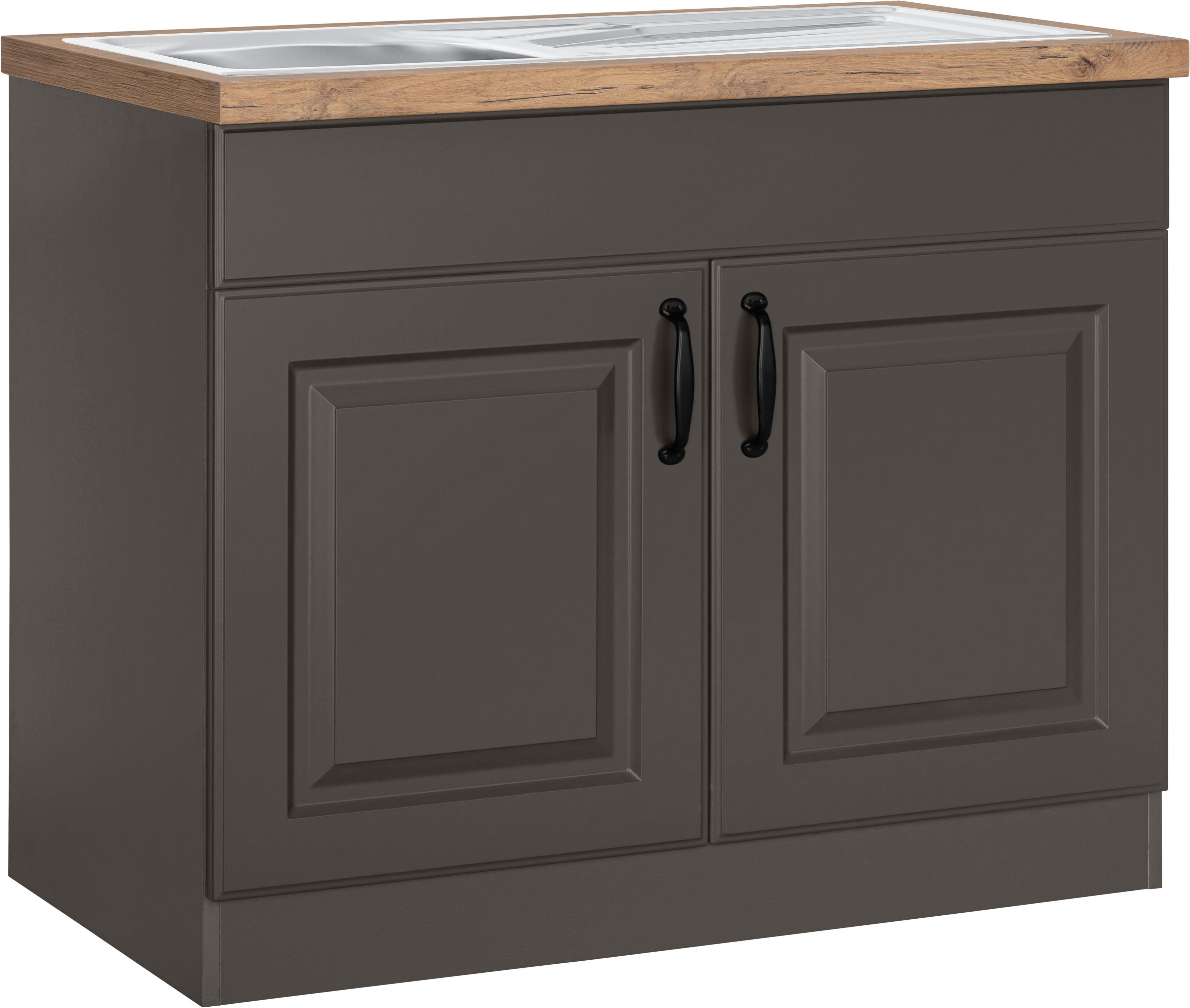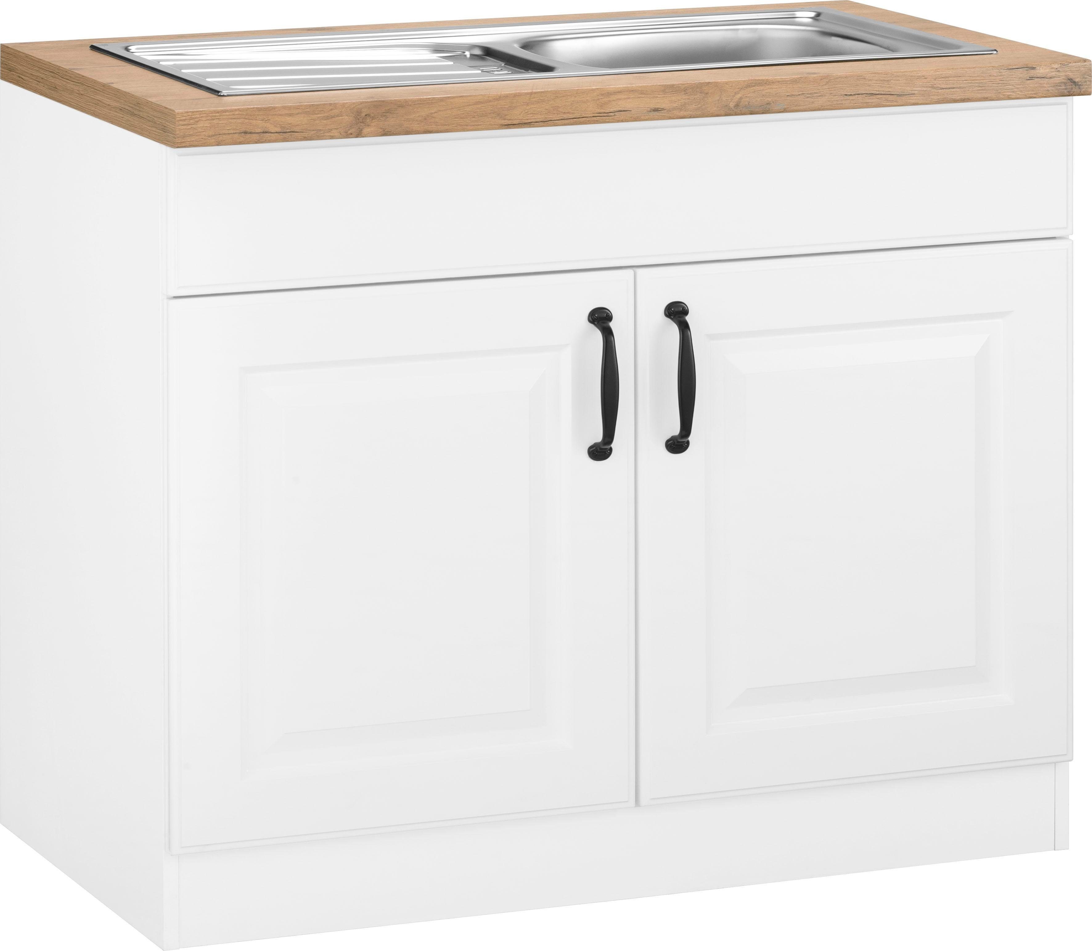 | Hinweis Lieferumfang | inkl. Edelstahl Einbauspüle mit Abtropffläche: Gesamtmaße (B/T): 86/43,5 cm, Maße des Spülbeckens: (B/T/Beckentiefe): 35/32/13 cm |