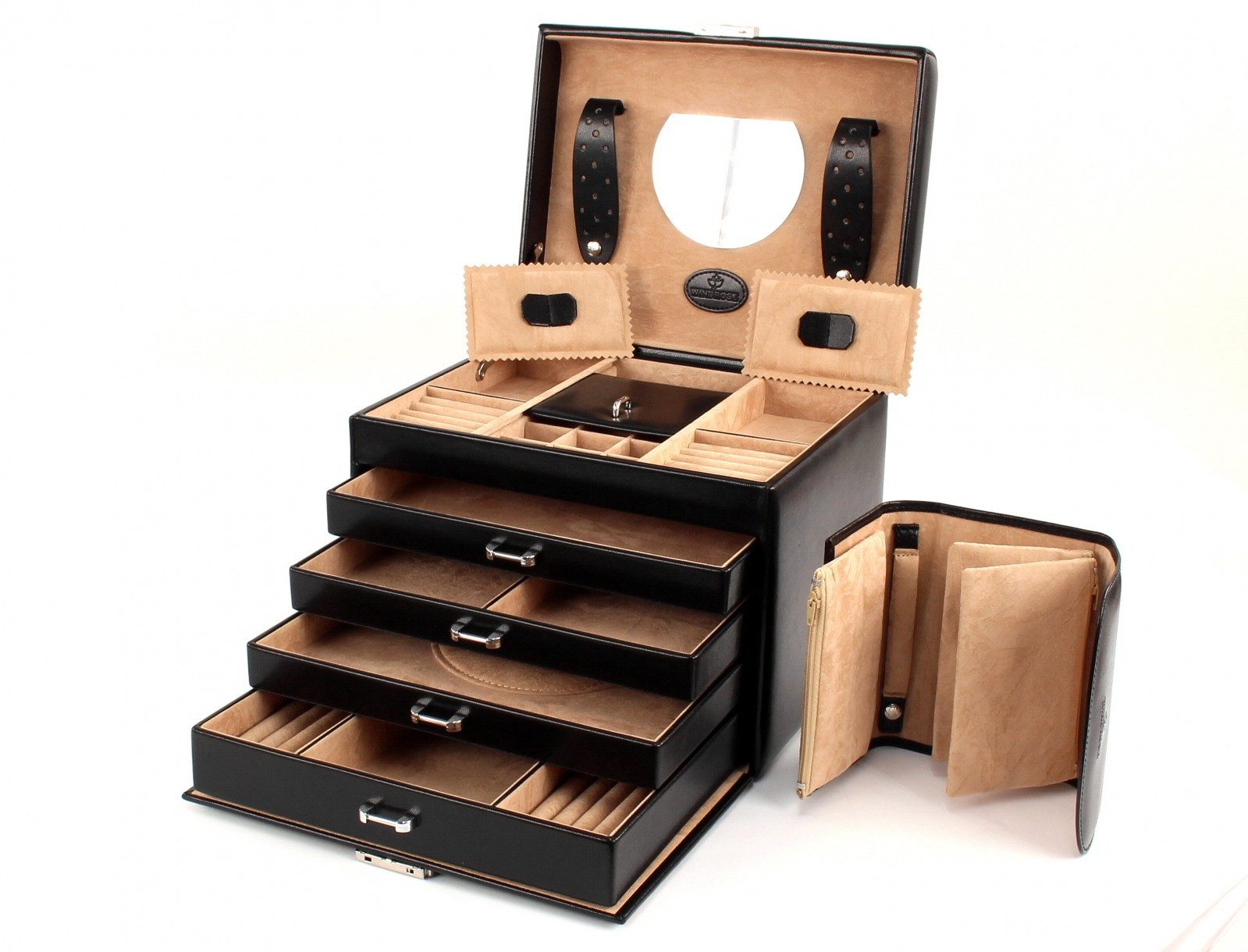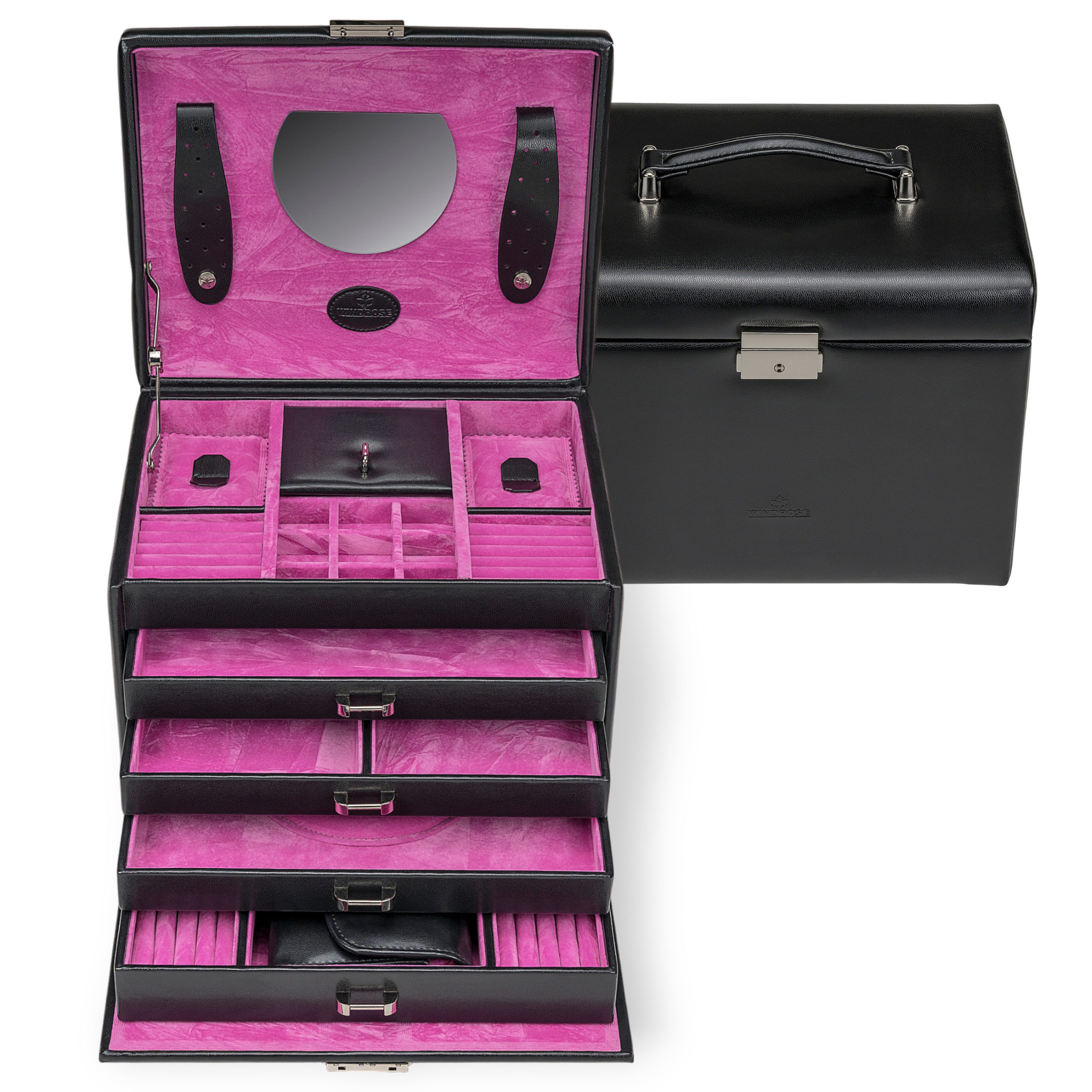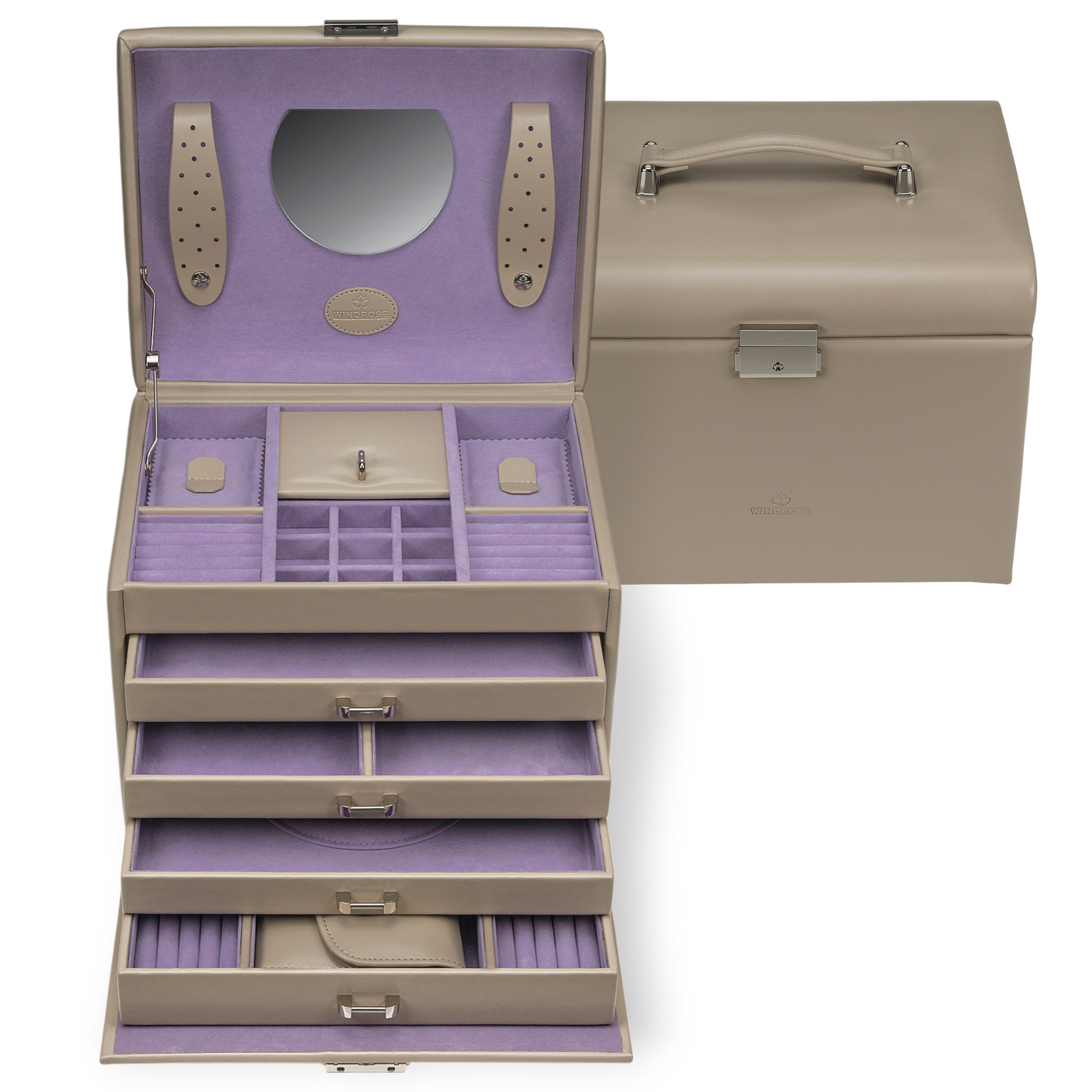 Diese Schmuckschatulle von WINDROSE passt auf Ihre besonderen Lieblingsteile auf! Um Staub oder andere Einflüsse müssen Sie sich mit der neuen Merino Moda Schmuckschatulle keine Sorgen mehr machen. Dank der übersichtlichen Etagen bringen Sie hier eine klare Ordnung in Ihre wertvolle Sammlung. Auch die zusätzliche Utensilientasche können Sie Ihren Schmuck auch unterwegs sicher verstauen. Mithilfe eines integrierten Spiegels zeigt die WINDROSE Merino Moda Jewelry Box Schmuckschatulle Ihnen gleich, wie Ihre Schmuckstücke Sie zum Strahlen bringen!