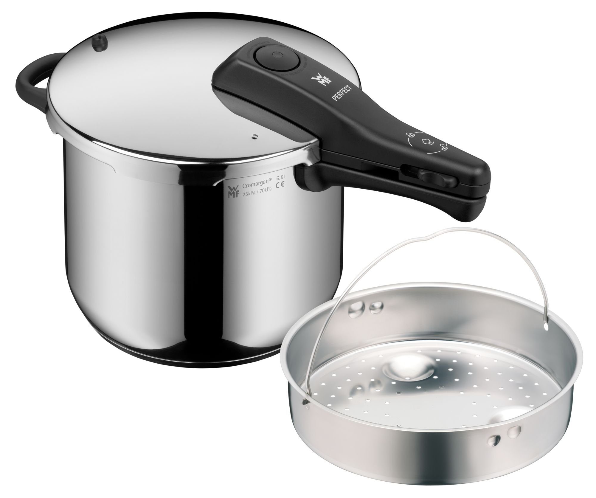 Perfekte Ergebnisse im Handumdrehen: Das zweiteilige Set WMF Schnelltopf Perfect 6,5 l + Einsatz ist wie gemacht für die Zubereitung vielseitiger Gerichte voller Geschmack sowie voller natürlicher Vitamine, Nähr- und Mineralstoffe in kürzester Zeit. Schmoren, Glasieren, Dünsten, Dämpfen: Das intuitive Kochsignal mit zwei Kochstufen ermöglicht eine komfortable, schnelle Zubereitung von zartem Gemüse, Fisch und Geflügel bis hin zu deftigem Fleisch, Kartoffeln und Eintöpfen. Dieser klassische Schnellkochtopf ist ganz leicht zu öffnen und zu schließen. Dafür sorgt ein seitlicher Schieber an dem mit einem Klick abnehmbaren Griff, der sich mühelos, hygienisch reinigen lässt. Gefertigt aus hochwertigem, spülmaschinengeeignetem Cromargan®: Edelstahl Rostfrei 18/10 punktet der WMF Schnelltopf Perfect auf allen Herdplatten mit optimaler Wärmeverteilung. Sein mehrstufiges Sicherheitssystem mit stufenweiser Abdampffunktion sorgt dabei für unbesorgtes Schnellkochen in jeder Küche. Äußerst praktisch ist zudem die Innenskalierung für präzises Dosieren und Abmessen sowie der Dämpfeinsatz für die besonders schonende Zubereitung von Gemüse oder Fisch.