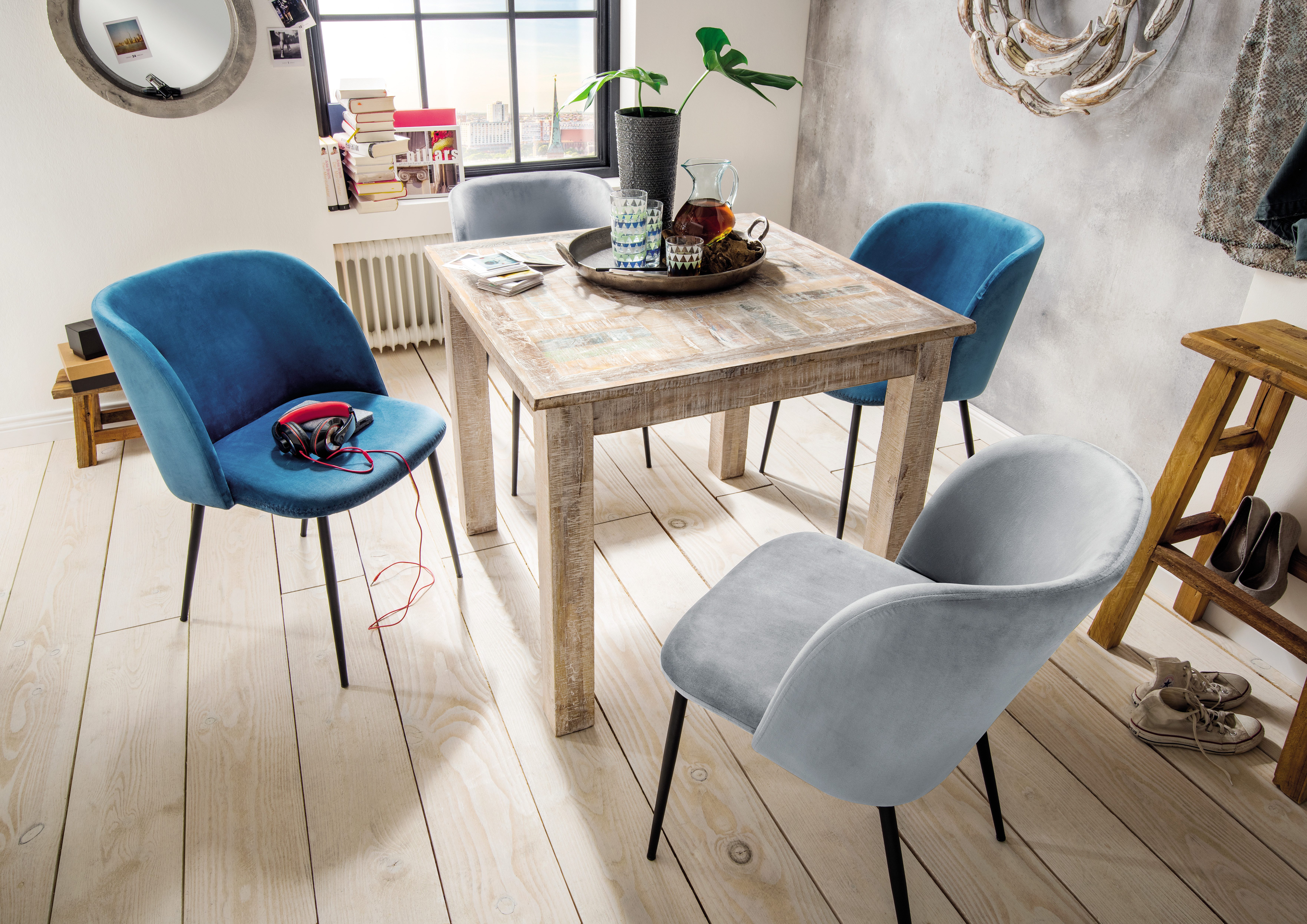 Dieses 2er-Set Design-Stühle besticht durch sein auffälliges Aquablau und schwarze Beine. Die Kombination verleiht jedem Raum einen modernen Touch. Trotz des herausragenden Designs ist der Preis unschlagbar, so dass Sie Stil und Erschwinglichkeit genießen können. Bezug: Samt-Velvet (100% Polyester), aqua-blau (+20000 Martindale) im skandinavischen Retro-Design, belastbar bis 120 Kg Beine: Metall schwarz pulverbeschichtet B/H/T: ca. 53 x 83 x 63 cm, Sitzhöhe ca. 46 cm, Sitztiefe ca. 44 cm die Lieferung erfolgt mit je 2 Stück, zerlegt (einfache Montage), in Karton verpackt (keine Einzelabnahme möglich!)
