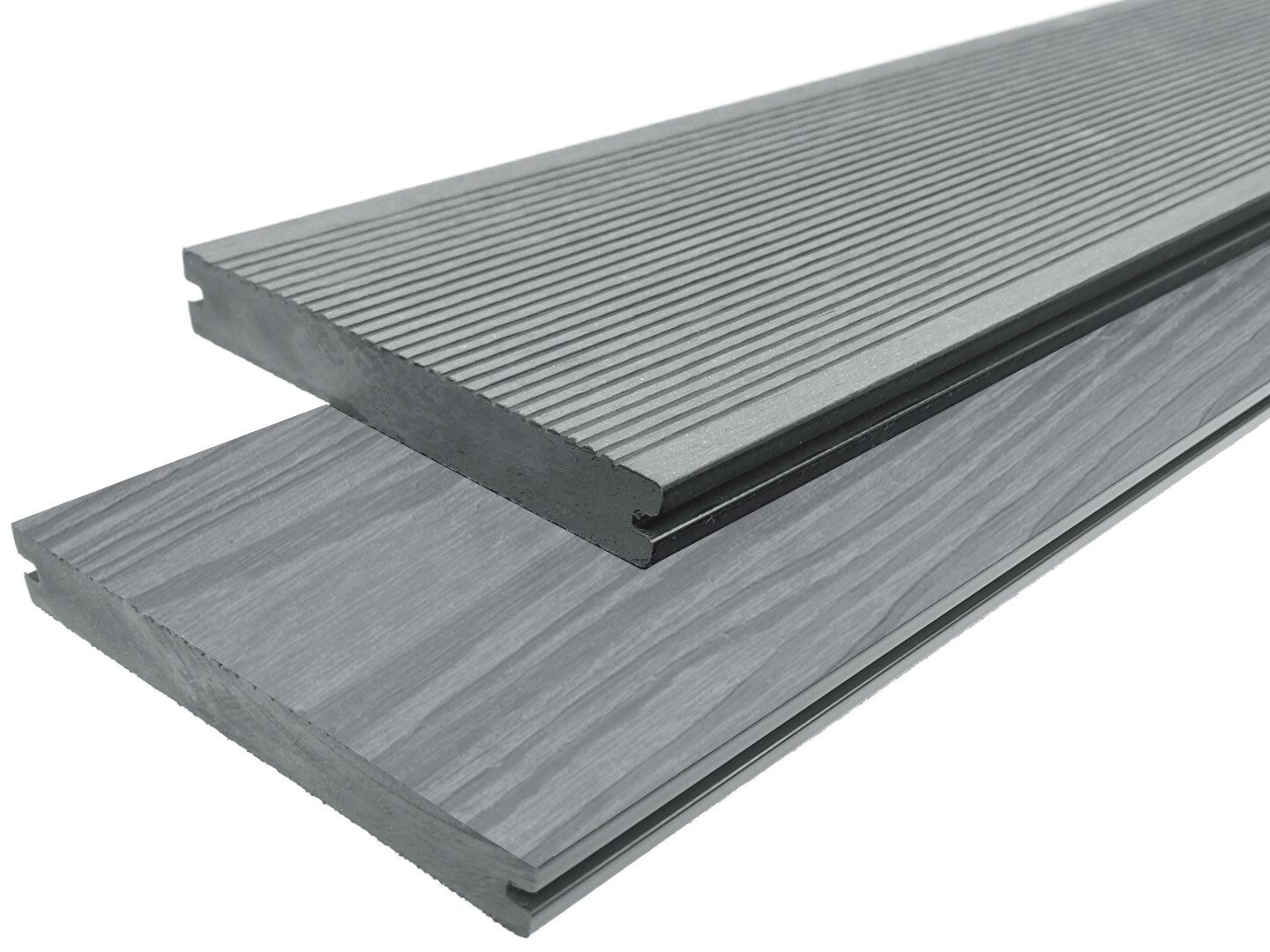 Das Muster besteht aus originalem Wood Plastic Composite in massiver Ausführung. Dieser langlebige Verbundwerkstoff aus Holzfasern und Kunststoff wurde speziell für den dauerhaften Außeneinsatz entwickelt. Er ist witterungsbeständig, farbstabil, splitterfrei und pflegeleicht. Die gebürstete und strukturierte Oberfläche vermittelt ein authentisches Bild der final verlegten Dielen und zeigt, wie angenehm sich das Material in Barfußbereichen anfühlt.