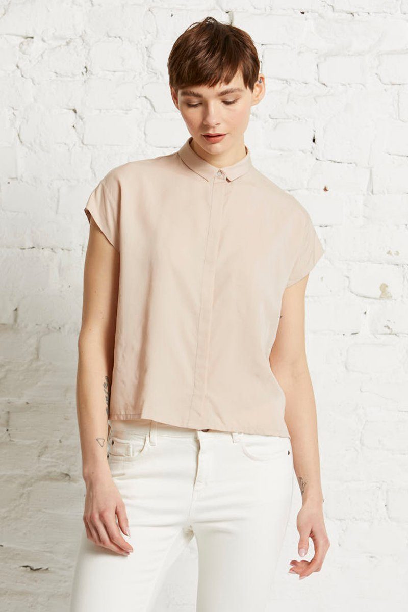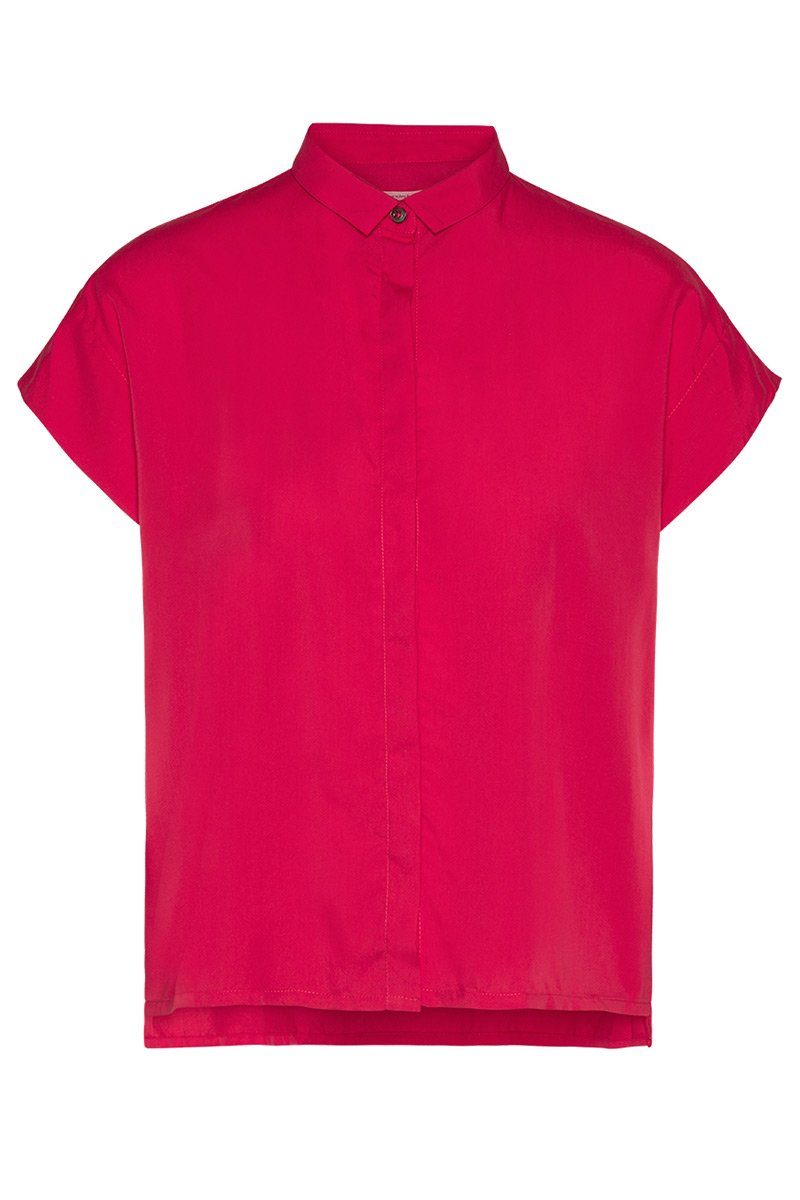 Die luftige Bluse aus 100% TENCEL™ ist federleicht und angenehm kühl auf der Haut. Clean und minimalistisch im Stil, aber mit liebevollen Details, die sie zu etwas ganz Besonderem machen, gehört sie zu unseren absoluten Lieblingsteilen. Die Bluse ist vorn etwas kürzer geschnitten als hinten und hat kleine Seitenschlitze. So sieht sie auch über Hose oder Rock super aus und kann hervorragend zu High Waist Styles getragen werden. Der kleine Kragen, eine verdeckte Knopfleiste und leicht fallende, angeschnitten Ärmel unterstreichen den modernen Look. Sie passt zu absolut allem, ob Boyfriend Jeans oder Business Anzug. Unser Model trägt Größe S.