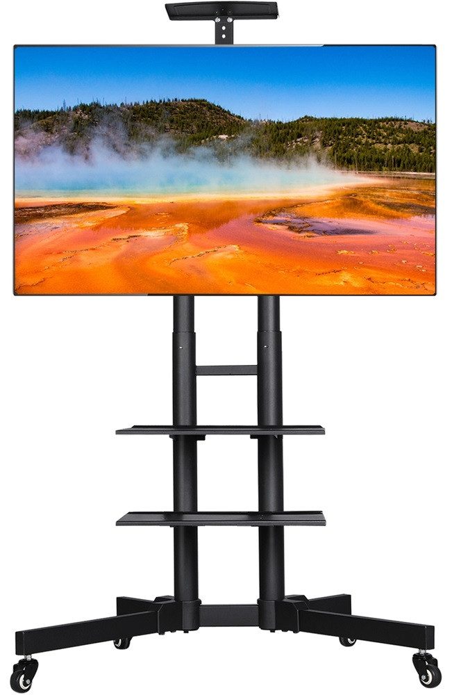 Die Vielseitigkeit dieses TV-Ständers zeigt sich durch seine Einstellungsmöglichkeiten: Die Höhe des Fernsehers kann einfach von 110 cm bis 160 cm verstellt werden, um eine optimale Sichtposition zu erreichen. Zusätzlich ermöglicht der Ständer das Neigen des Bildschirms, um den Betrachtungswinkel anzupassen. Dank seiner vier flexiblen Räder lässt sich der Ständer leicht bewegen und drehen, was eine Betrachtung aus verschiedenen Positionen und die Nutzung in verschiedenen Räumen ermöglicht. Er eignet sich für Wohnzimmer, Schlafzimmer, Büro, Konferenzraum, Messen, Fitnessstudios und mehr.