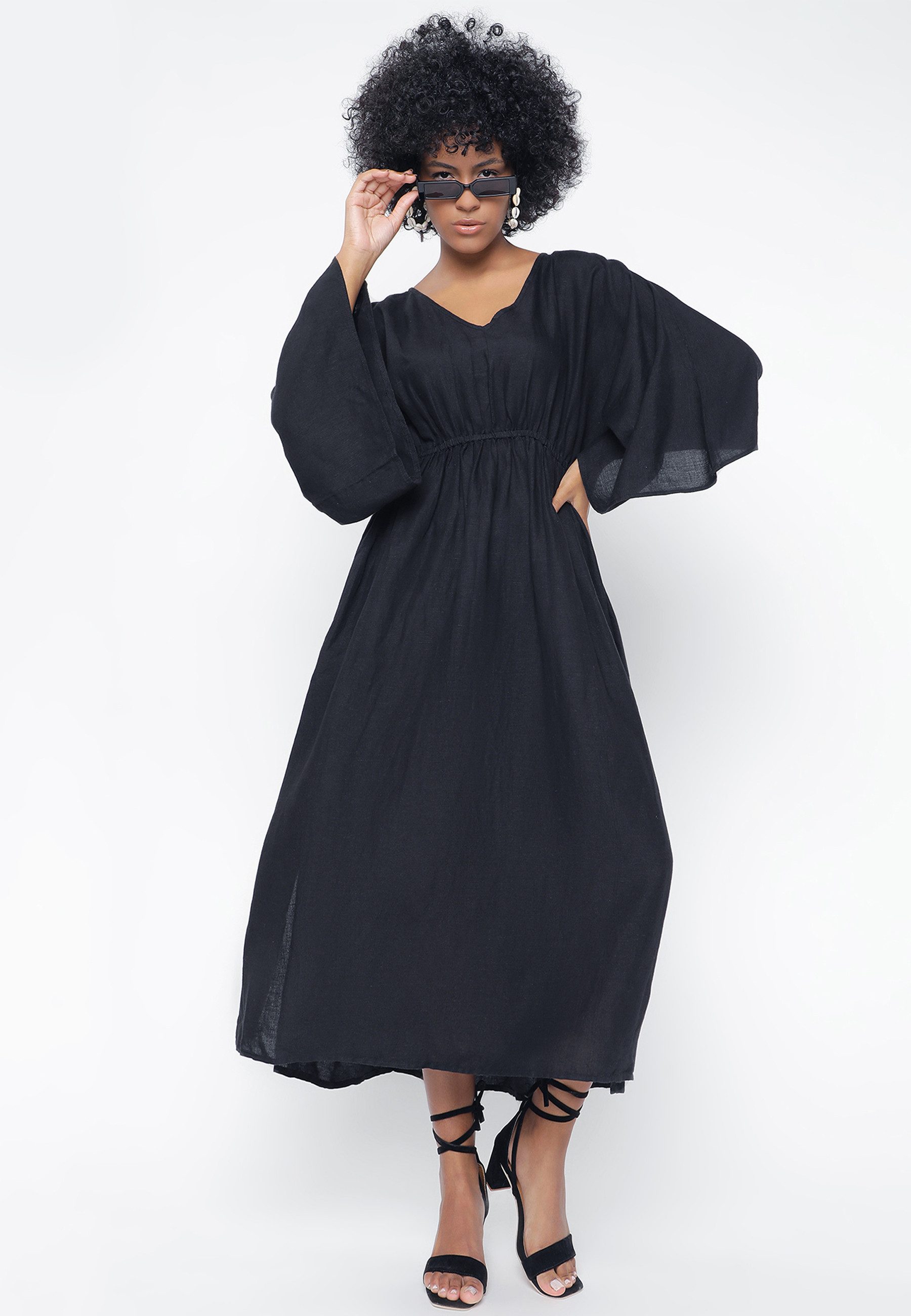 Entdecken Sie zeitlose Eleganz mit unserem weißen Sommerkleid aus hochwertigem Leinen. Dieses Kleid vereint Komfort und Stil in perfekter Harmonie. Mit seinem tiefen V-Ausschnitt und den weiten, dreiviertellangen Ärmeln strahlt es eine entspannte und luftige Eleganz aus. Die leicht geraffte Taille betont Ihre Silhouette auf schmeichelhafte Weise und sorgt für eine feminine Note.