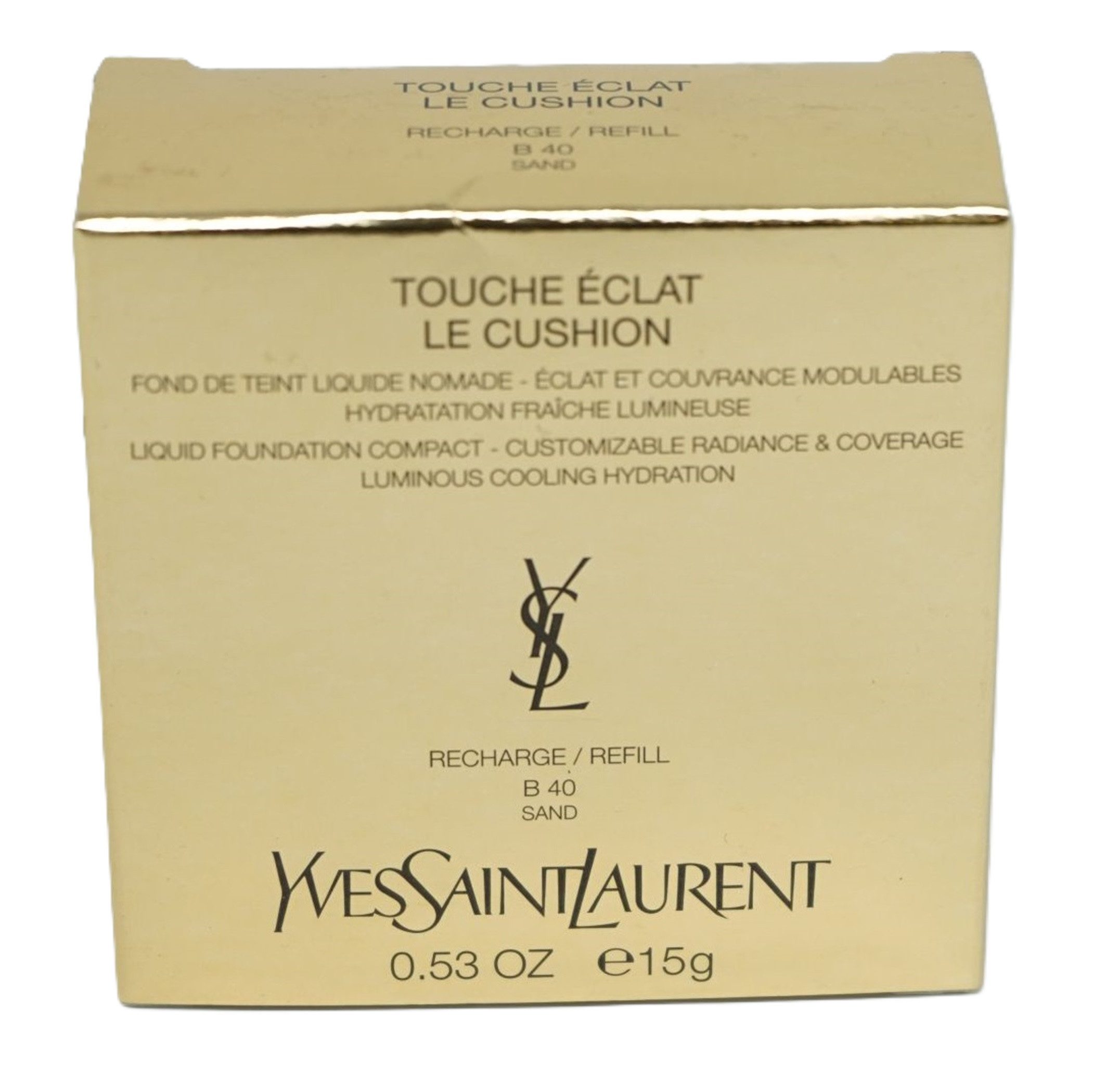 Yves Saint Laurent Touche Éclat Le Cushion Foundation Refill B40 Sand bietet eine frische, strahlende Deckkraft mit der einfachen Anwendung eines Cushions Die leichte, feuchtigkeitsspendende Formel gleitet sanft über die Haut und sorgt für einen ebenmäßigen, natürlichen Glow, während Unregelmäßigkeiten kaschiert werden Farbton B40 Sand ist ideal für mittlere Hauttöne mit warmen Untertönen