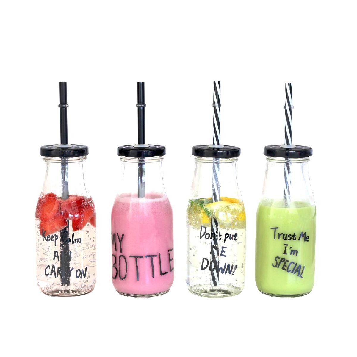 440s Glas Trinkflaschen 4er Set mit Verschluß und Trinkhalm, je ca. 0,3 L Diese stylischen Glas-Flaschen erfrischen mit ansprechenden Botschaften. Die trendigen Message-Bottles tragen die vier Aufschriften: MY BOTTLE, Keep Calm And CARRY ON, Trust Me I'm SPECIAL und Don't put ME DOWN. Verschiedene Erfrischungsgetränke kommen in den transparenten Flaschen hinter den schwarzen Buchstaben ganz prima zur Geltung. Die vier Trinkgefäße aus Klarglas mit ihren kessen Aufschriften werden mit Trinkhalmen und einem stabilen, wiederverschließbaren Metalldeckel geliefert und können somit bei vielen Einsätzen, nicht nur im Freien, Sommerlaune verbreiten. Produktdetails 440s Glas Trinkflaschen 4er Set mit Verschluß und Trinkhalm, je ca. 0,3 L: Im Lieferumfang: 4 Flaschen mit 4 verschiedenen Aufschriften, 4 Deckel, 4 Trinkhalme Material Flasche: Glas Material Schraubverschluss: Metall, Blech mit Dichtungs-Gummi-Pfropfen Material Trinkhalm: Kunststoff Maße Flasche: ca. 15 cm H x 6 cm D Farbe: Glas in klar transparent, Aufschrift in schwarz, 2 Trinkhalme in schwarz-weiß geringelt, 2 Trinkhalme in schwarz 4 verschiedene Aufschriften: MY BOTTLE, Keep Calm And CARRY ON, Trust Me I'M SPECIAL, Don't Put ME DOWN! Fassungsvermögen je Trinkflasche: ca. 0,3 Liter Dieses Angebot gilt für ein 4er Set 440s Glas-Trinkflaschen mit vierfach sortiertem Aufdruck, Verschluß und 4 Trinkhalmen, mit einem Fassungsvermögen von jeweils ca. 300 ml, Artikel Nummer KJ-271018, ohne Dekoration oder weiteres Zubehör.