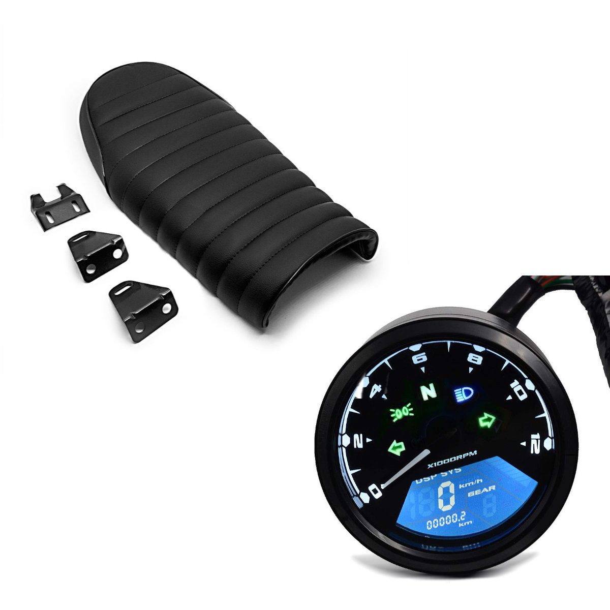 Lieferumfang: Tachometer LCD Digital Drehzahlmesser Analog Zaddox TM1 + Sitzbank für Cafe-Racer oder Scrambler Umbau Flat schwarz