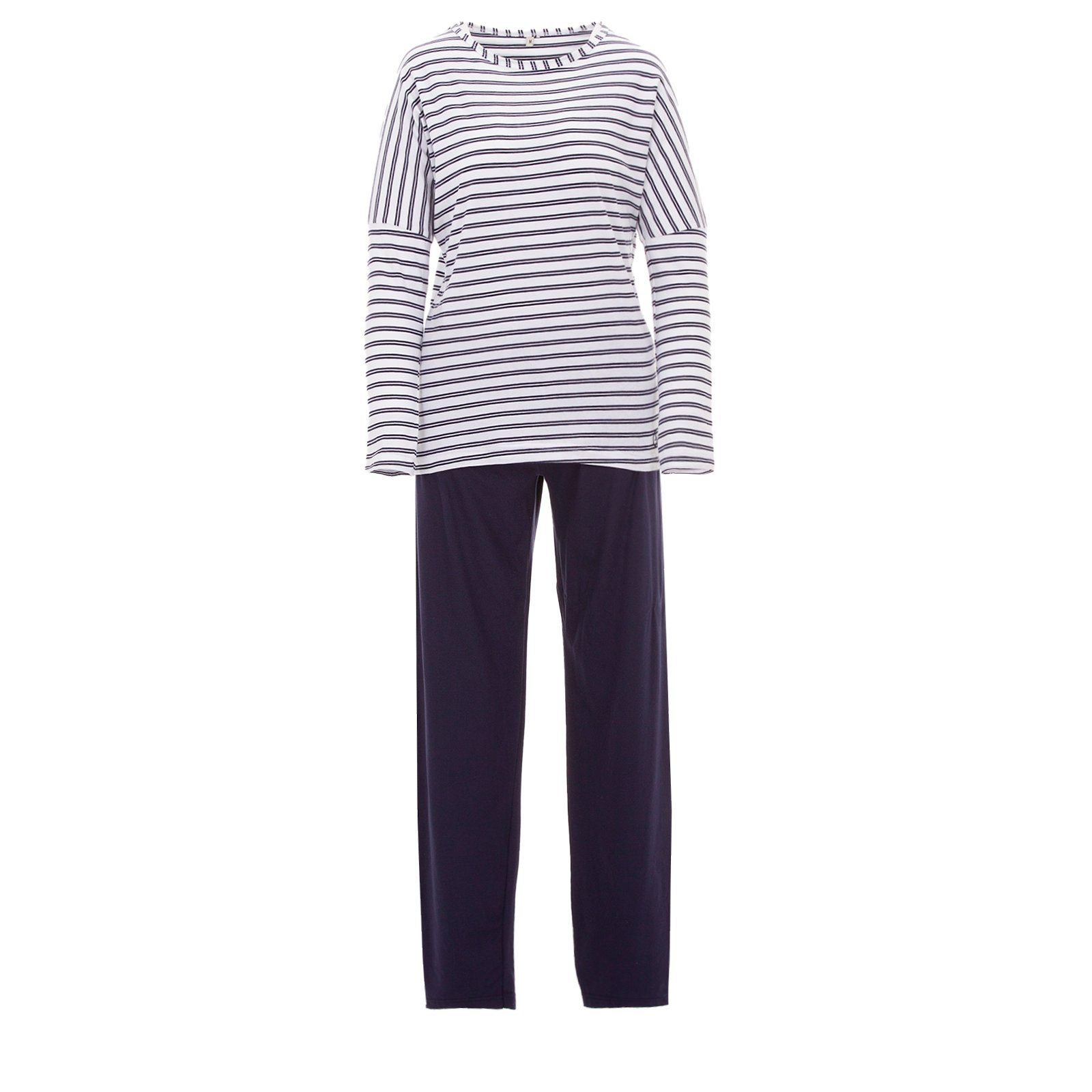 Der angemehm weiche langarm Pyjama in klassischem Design wird Ihnen große Freude bereiten. Komfortabler Schnitt mit Ton in Ton Label Stickerei am Saum. Schön gearbeitetes Oberteil, mit abgesetzten Muster an den Armen. Die Pyjamahose ist uni in dunkelblau und mit einer Satinschleife versehen.