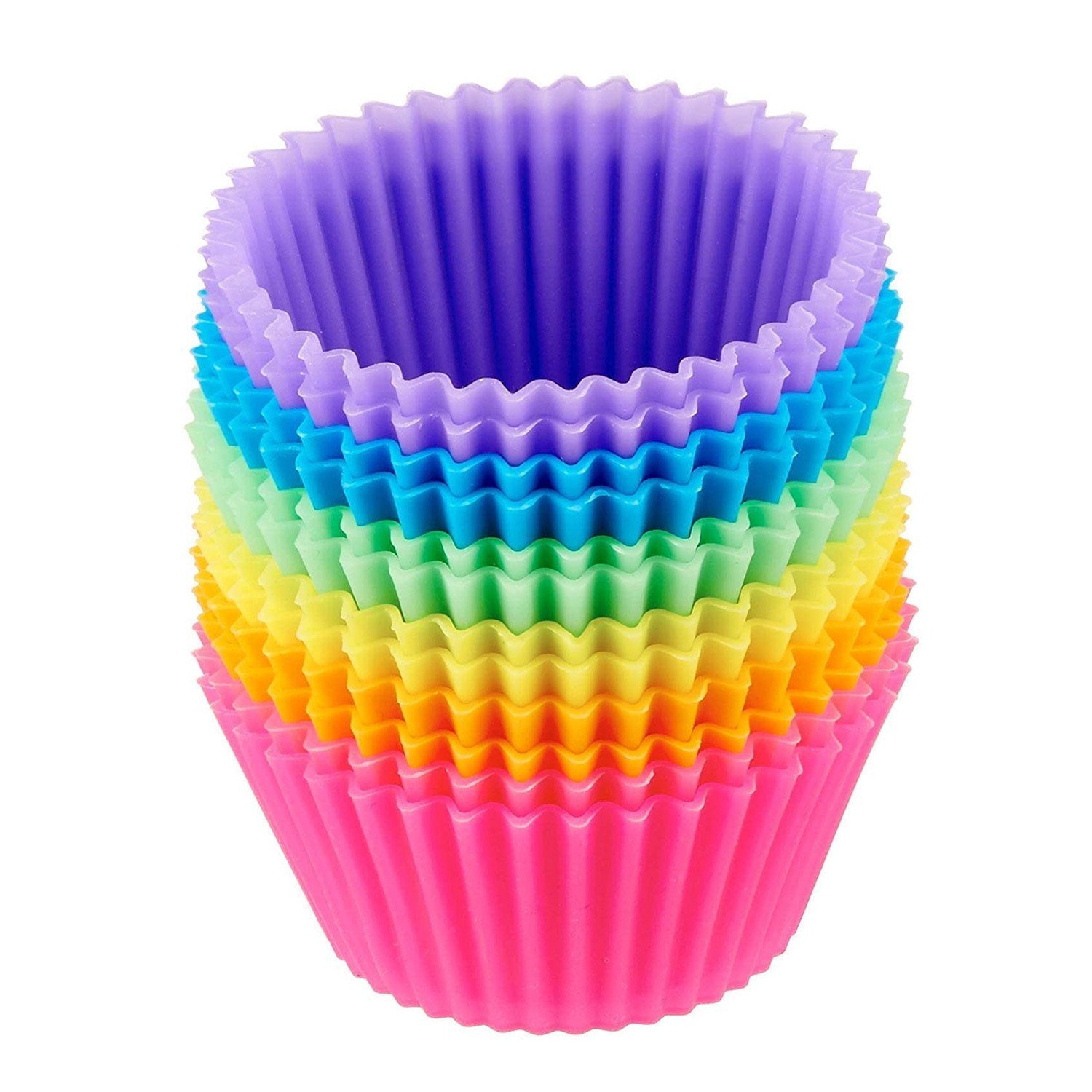 Dieser 12er-Pack wiederverwendbarer ZggzergSilikonbackförmchen ist eine ausgezeichnete Alternative zu Einweg-Backförmchenaus Papier. Die Backförmchen passen in jedes Standard-Muffinblech und könnensogar, je nach Teigart, freistehend auf einem Backblech platziert werden.Dieser Xer-Pack Backförmchen ergibt zusammengesteckt einen schönen buntenRegenbogen. Enthalten sind 2 Stück jeder der folgenden Farben: Pink, Orange,Gelb, Grün, Blau und Lila. Jedes Backförmchen ist 3,5 cm hoch, hat einen 5 cmbreiten Boden und eine 7 cm breite Öffnung oben.