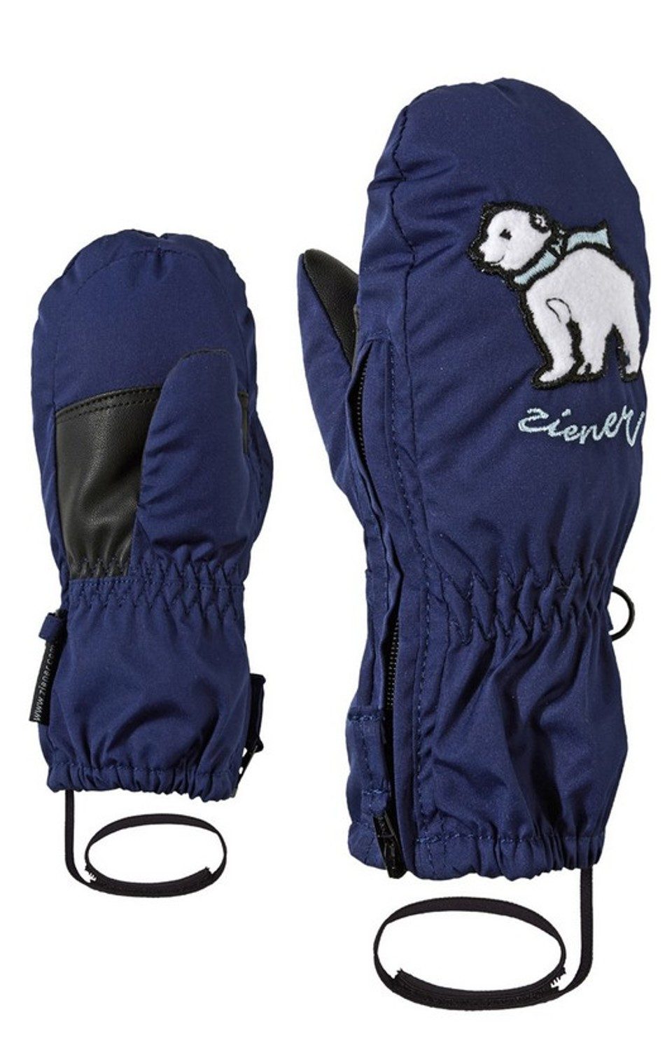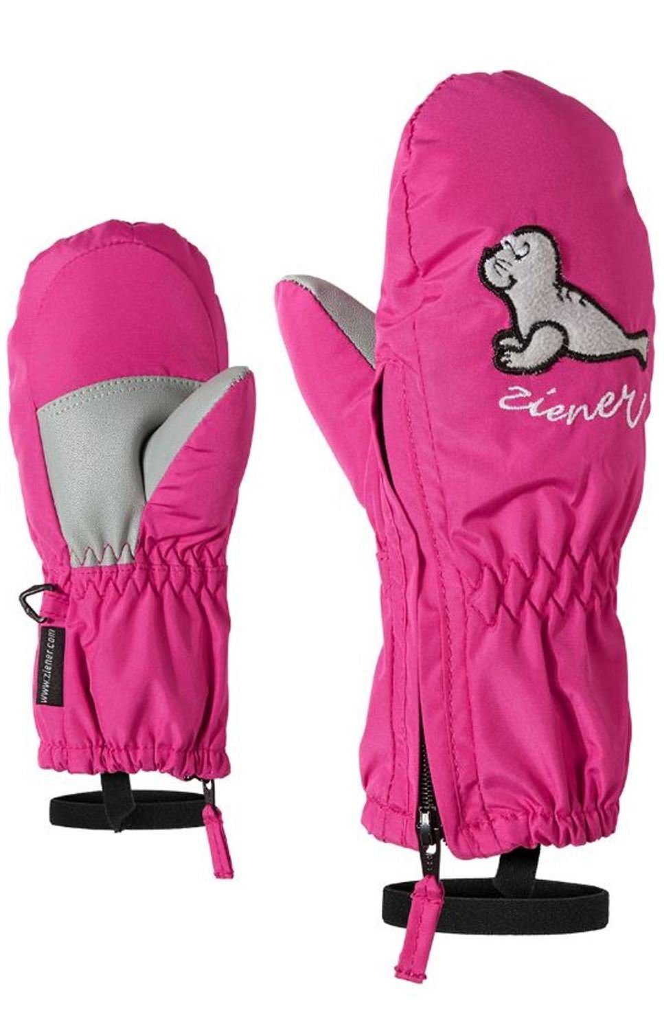 Die niedlichen, warmen ZIENER Miniskifäustlinge LE ZOO MINIS für Kleinkinder punkten mit lustigen, verspielten Tiermotiven und aufwendigem Design. Zwei der Produkte sind mit den beiden Comic-Helden Ixi und Mimi aus Felix Neureuthers Kinderbuch "Auf die Piste, fertig, los!" versehen. Die extra weite Reißverschlussöffnung bis über den Daumen erleichtert das An- und Ausziehen enorm. Die lange Stulpe mit Gummizug schließt optimal über der Jacke ab und verhindert das Eindringen von Schnee. Besonders weiche Funktionsmaterialien sowie die warme ZIENER THERMOSHIELD® Membran machen diese Handschuhe zum treuen Begleiter an kalten Tagen. Mit der elastischen Leash lassen sich die Handschuhe zusätzlich am Handgelenk befestigen. Die Handschuhe sind von Größe 1 bis Größe 4 erhältlich.