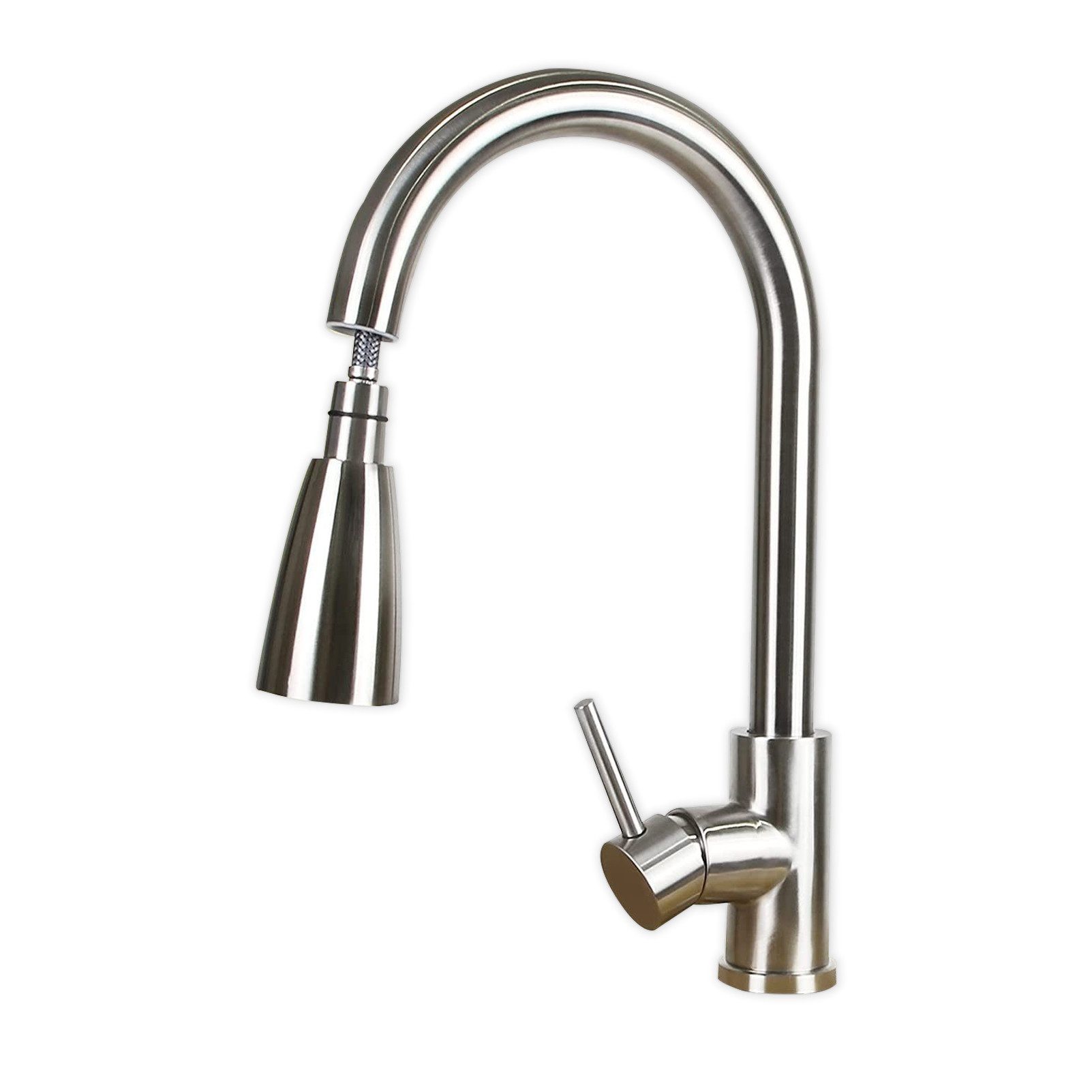Hochwertiger Wasserhahn: aus hochwertigem Edelstahl 304. Die Oberfläche ist gebürstet, was leicht zu reinigen ist und keinen Schmutz hinterlässt. Das geflochtene Rohr aus Metall 304 ist beständig gegen Wasserdruck und kann nicht leicht auslaufen.