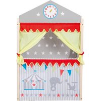 Vorhang auf und los geht's! Ein Kasperletheater dient als Spielkulisse für Handpuppen. Durch sein farbenfrohes Design und seine Motive, wie zum Beispiel Schloss, Haus oder Stadt, bietet es für Märchenerzählungen und fantasievolle Geschichten einen passenden Rahmen. Puppentheater bestehen aus einem stabilen Holzgestell und einem beweglichen Stoffvorhang. Du kannst sie flexibel in jedem Raum aufstellen. Das Gestell sollte stets fest und sicher auf dem Boden stehen, damit es nicht umkippen kann.