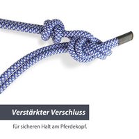 Beachte, dass Knotenhalfter in verschiedenen Größen erhältlich sind, meist von Pony bis Warmblut. Orientiere dich an den Herstellerangaben und vergleiche sie mit deinen Messungen. Ein zu enges Halfter kann Druckstellen verursachen, während ein zu weites verrutschen und unsicher sein kann. Nimm dir Zeit für die Anpassung. So kannst du möglicherweise sicherstellen, dass das Knotenhalfter bequem sitzt und seine Funktion erfüllt.