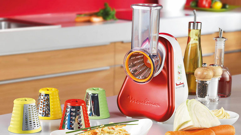 Gemüse lässt sich in vielen unterschiedlichen Formen verarbeiten. Zucchini und Paprika kannst du im Ganzen etwa mit Möhren, Feta sowie Hackfleisch füllen. Zerkleinert passt Gemüse gut in Salate, Eintöpfe und mehr. Mit dem Messer geschnitten sind Scheiben und Streifen aber schnell ungleichmäßig. Beim Garen kann es sein, dass manche Stücke mehr durch sind als andere. Abhilfe schafft da der Zerkleinerer von Moulinex. Das handliche Gerät zerkleinert die Lebensmittel mit fünf verschiedenen Aufsätzen gleichmäßig. So reibst du etwa Parmesan, schneidest Gurken in gleichdicke Scheiben, Karotten in dünne Streifen oder raspelst Zwiebeln. Alles elektrisch und somit schnell und unkompliziert erledigt.