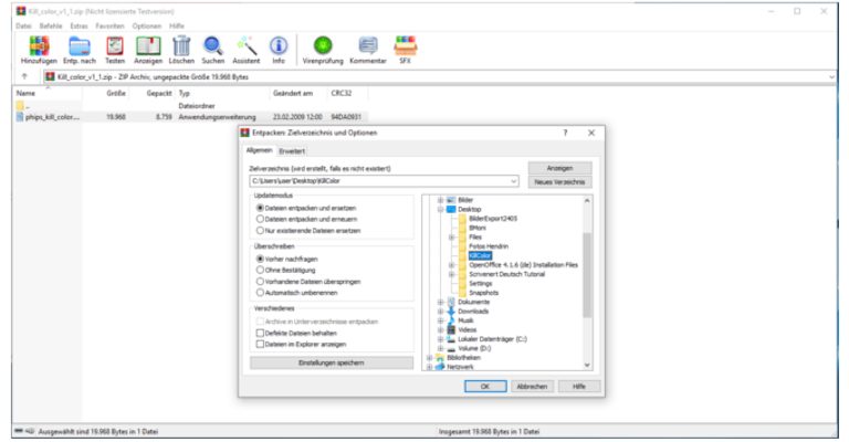 © 2019 WinRAR / Screenshot / UPDATED - Wähle über Desktop den von dir angelegten Ordner (in unserem Fall KillColor) aus und bestätige unten mit OK.