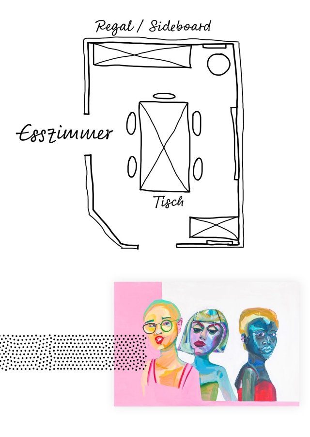 Eine Wand im Esszimmer hat Andi schwarz gestrichen. Dunkel wirkt der Raum dadurch nicht – die schwarze Wandfarbe lässt die Farben im Esszimmer noch schöner leuchten. Das gilt vor allem für das große Wandbild, das eine befreundete Künstlerin gemalt hat.