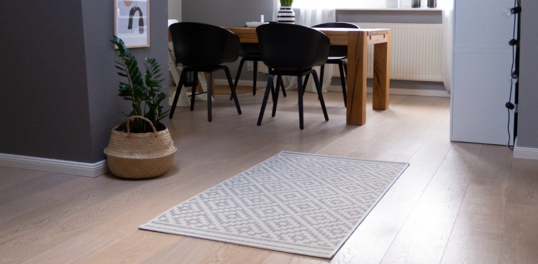 Ist der Teppich nur wenig größer als der Tisch, wirkt der Essbereich zusammengedrängt und ungemütlich. Besser ist ein Kurzflorteppich, der an allen Seiten mindestens 50 cm breiter ist als der Tisch: So kannst du auch die Stühle problemlos zurückziehen.
